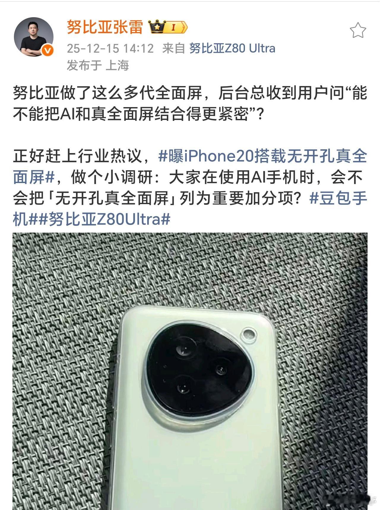 曝iPhone20搭载无开孔真全面屏看到这话题第一反应是:这个赛道,努比亚已经默默跑了十多年。从早年无边框到努比亚Z80Ultra 的天空全面屏,它在挖孔主流中死磕完整视觉,这份坚持不从众很难得。如果巨头苹果入局肯定会带火赛道,但那些不随流的技术探索,才让“真全面屏”从概念到落地成真。