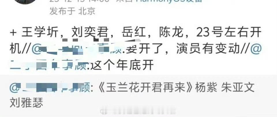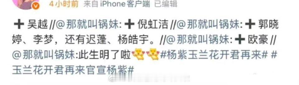 娱乐网传杨紫玉兰花开君再来有两个不同阵容 忘川杨紫《玉兰花开君再来》有两个完全不同阵容的🍉版本版本一:杨紫,欧豪,郭晓婷,李梦,迟蓬,杨浩宇,倪虹洁,吴越(还有说吴慷仁是男主,欧豪是男二)版本二:杨紫,朱亚文,刘雅瑟,王学圻,刘奕君,岳红,陈龙玉兰花开君再来配角阵容