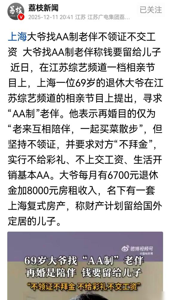 上海一个大爷,月入一万四,想找个老伴儿。条件是:AA制,不领证,工资卡自己拿着,遗产全给国外的儿子。 说白了,就是想招个免费保姆,还得是倒贴钱的那种。 这哪是找老伴,分明是场精明的算计。把感情当生意做,最后恐怕只剩一屋子冷清。 最近网上这类事真不少。有些上了年纪的人,找伴目的不纯。不是图互相照顾,而是想省保姆钱,甚至惦记对方那点退休金。上海这位大爷的条件,简直集大成者。AA制生活,不领证没保障,钱和房最后都归自己儿子。对方图啥?就图个伺候人的机会? 大爷可能觉得自个儿条件挺好。月入一万四,住着复式楼。可这些在明白人眼里,啥也不是。现在的阿姨,早不是旧社会模样了。很多有退休金有住房,生活丰富多彩。白天公园跳舞,晚上姐妹聚餐,节假日跟团旅游。自由自在,凭什么跳进火坑去给人当老妈子? 感情需要双向奔赴。陪伴是相互取暖,不是单方面索取。只想得到照顾,却不愿付出真心和保障,这算盘打得太响。婚姻或同居关系里,经济可以协商,但责任和尊重不能缺席。大爷把一切后路给自己留好,却要求对方无条件付出。这公平吗? 孤独确实难熬。但用算计来驱赶孤独,只会更孤独。钱能买来服务,买不来真情。感冒时床边那杯热水,带着温度的关怀,不是AA制能算出来的。把身边人当成成本来节约,最后节约掉的,可能就是最后一点人情味。 社会上总有人想把感情市场化。但有些东西,永远不能明码标价。尊重、爱护、相濡以沫,这些才是晚年幸福的真谛。指望空手套白狼,只能套住自己的晚景凄凉。 希望所有寻找陪伴的人,都能捧出真心。别让精明的计算,寒了人心,也冻醒自己每一个漫长的夜晚。温暖的家,得用两颗真诚的心才能换来。 MCN双量进阶计划