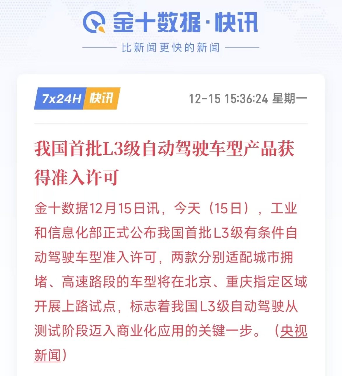“今天(15日),工业和信息化部正式公布我国首批L3级有条件自动驾驶车型准入许可,两款分别适配城市拥堵,高速路段的车型将在北京,重庆指定区域开展上路试点”万万没想到,于无声处听惊雷呀!而且居然还适配了城市场景,我本来以为只会有高速的试点试点城市也不是我想象中的深圳,居然是北京和重庆你们猜是哪两款车呢?