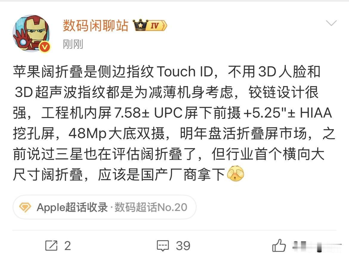 数码博主曝苹果折叠手机配置:有侧边指纹,没有3D人脸和超声波。 就在刚才,知名数码博主,拿到了苹果折叠手机的最新消息,根据目前他过来掌握的信息来看,估计和华为的三折叠还是有区别的,但是他强调了他中间开合的那个设计,不知道苹果能不能做到完全平整! 不过有人认为苹果现在才出折叠手机,是不是慢了,因为三星和华为都出了,他要等一年之后再出,而且还不是三折叠,只是双折叠,会不会像今年的air一样不被大家认可。 不过这个博主认为,苹果首款大折叠的吸引力,应该还是比较不一样,毕竟苹果差不多二十年一直用的直屏,这次改成折叠对他这个品牌还是头一回,所以他认为如果这个折叠手机出平了,他的受关注程度应该远高于超薄Air,不过最终的销量还是要看市场。 毕竟这个市场的用户群体,与直板用户群体还是有趣比较大的区别的,到时候我们拭目以待!