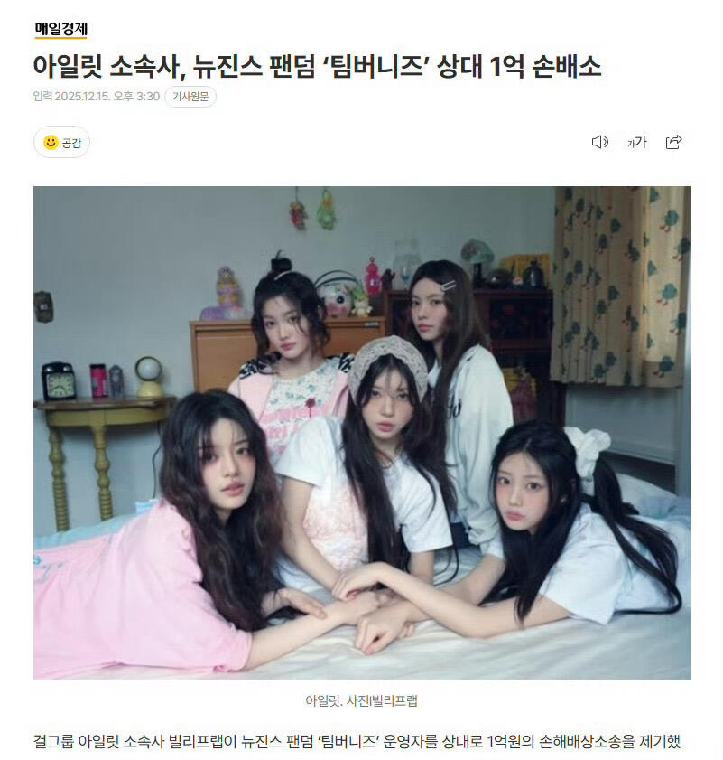 ILLIT所属公司Belift Lab向NewJeans粉丝团"Team Bunnies"运营者提起1亿韩元损害赔偿诉讼。