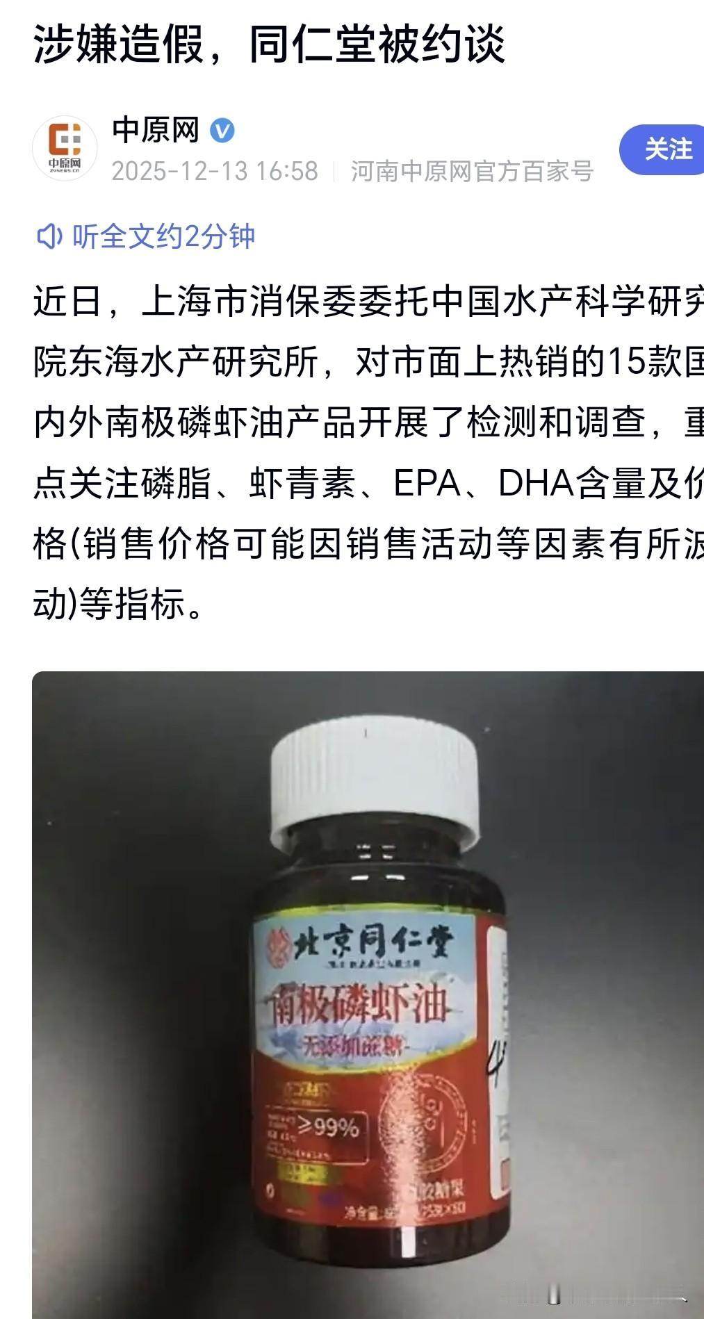 一款在网页上标注为 “北京同仁堂99%高纯南极磷虾油” 的产品,宣称磷脂标识值为43%,可实测含量却是0。 你能想象,这竟是中国著名的百年老字号企业所为吗? 对于这种明目张胆造假、欺骗消费者的行径,若仅仅进行约谈,无异于罚酒三杯、隔靴搔痒,不仅无法起到惩罚作用,还会开一个极坏的先例。 当然,我相信此次“约谈”应是该事件调查处理的开端,而非最终结果。倘若查实存在违法行为,涉事企业必将面临更为严厉的法律制裁。