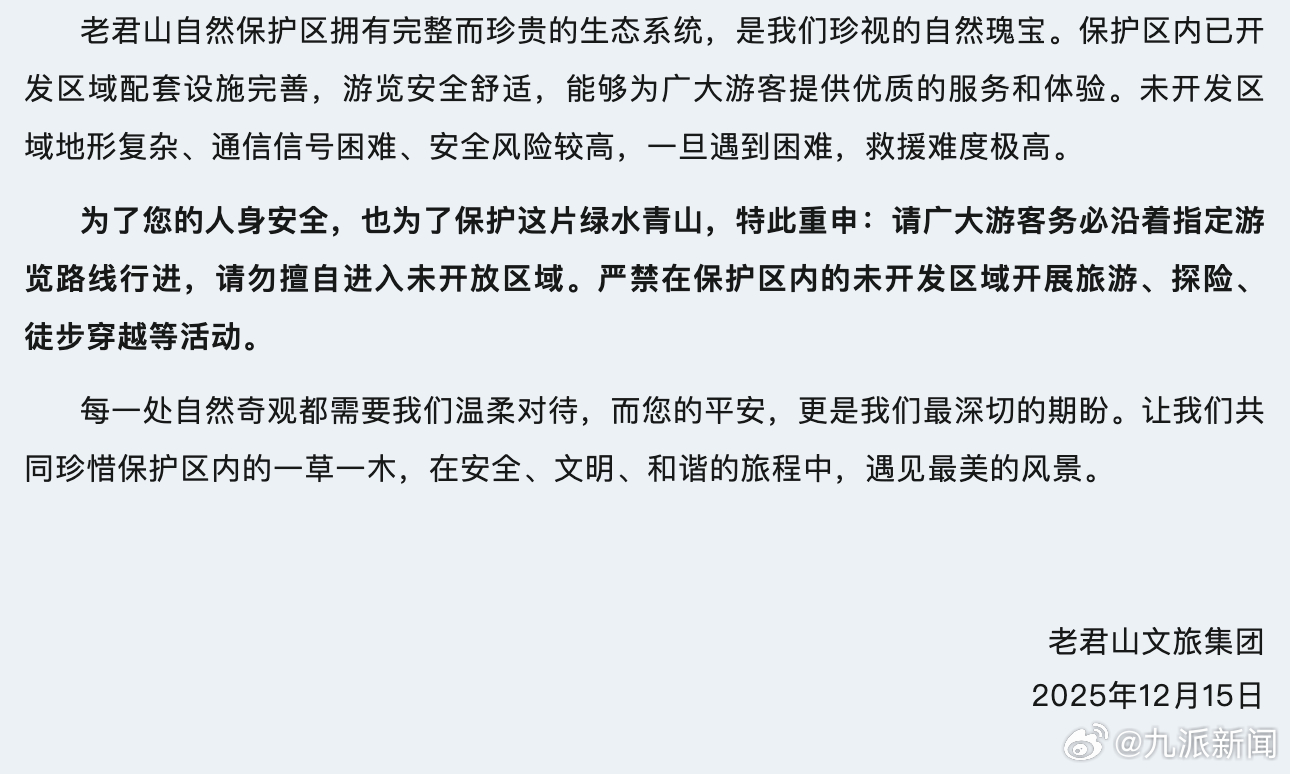 【#老君山通告禁止在未开发区域徒步#】12月15日,老君山景区发布关于禁止在老君山自然保护区未开发区域开展旅游探险(徒步穿越)等活动的通告:老君山自然保护区拥有完整而珍贵的生态系统,是我们珍视的自然瑰宝。保护区内已开发区域配套设施完善,游览安全舒适,能够为广大游客提供优质的服务和体验。未开发区域地形复杂、通信信号困难、安全风险较高,一旦遇到困难,救援难度极高。为了您的人身安全,也为了保护这片绿水青山,特此重申:请广大游客务必沿着指定游览路线行进,请勿擅自进入未开放区域。严禁在保护区内的未开发区域开展旅游、探险、徒步穿越等活动。每一处自然奇观都需要我们温柔对待,而您的平安,更是我们最深切的期盼。让我们共同珍惜保护区内的一草一木,在安全、文明、和谐的旅程中,遇见最美的风景。此前,据媒体报道,12月14日,有网友在社交平台发布视频称,12日有驴友围绕河南省洛阳市老君山自然保护区的野线进行徒步穿越,发生意外死亡。有驴友在相关事件的讨论中提到,上述信息可能是谣言,也有驴友表示,12日确实有两位驴友在山里拨打了应急电话后获救。12月15日,潇湘晨报记者致电栾川县消防大队鸾州大道消防救援站,接电工作人员称,“没有接到这方面警情”,并告诉记者,如养子沟区域出现驴友拨打119的情况,会由该消防救援站出警。记者致电栾川派出所,工作人员表示“具体情况不太清楚。”记者随后致电了栾川县公安局,工作人员表示“我们不清楚这个事情,等待官方发布公告吧。”记者还致电了老君山景区,工作人员称驴友走的“野穿”路线归属养子沟景区,随后记者多次致电养子沟景区,均无人接听。