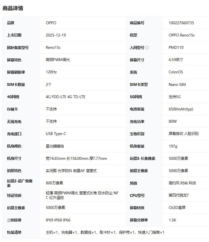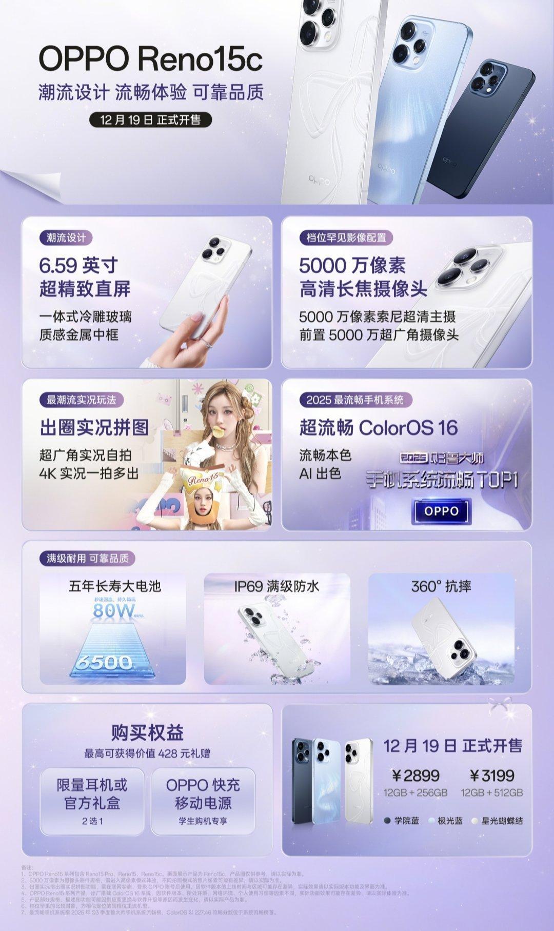 【OPPOReno15c手机12月19日开售:1.5KOLED直
