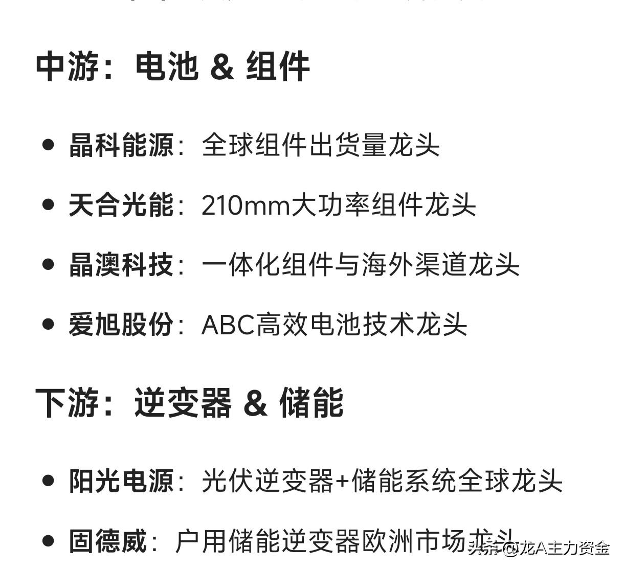 光伏概念细分龙头企业汇总: 上游:硅料 & 硅片 通威股份:全球高纯晶硅(硅料)龙头 大全能源:N型硅料龙头 隆基绿能:单晶硅片及HPBC电池技术龙头 TCL中环:大尺寸(G12)硅片龙头 中游:电池 & 组件 晶科能源:全球组件出货量龙头 天合光能:210mm大功率组件龙头 晶澳科技:一体化组件与海外渠道龙头 爱旭股份:ABC高效电池技术龙头 下游:逆变器 & 储能 阳光电源:光伏逆变器+储能系统全球龙头 固德威:户用储能逆变器欧洲市场龙头 辅材 & 设备 福斯特:光伏胶膜(EVA/POE)全球龙头 福莱特:光伏玻璃第二梯队龙头 迈为股份:HJT整线设备龙头 晶盛机电:单晶炉及碳化硅设备龙头 帝尔激光:光伏激光掺杂/开槽设备龙头 电站开发 & 运营 三峡能源:新能源电站投资运营龙头 正泰新能(正泰电器旗下):户用光伏装机龙头