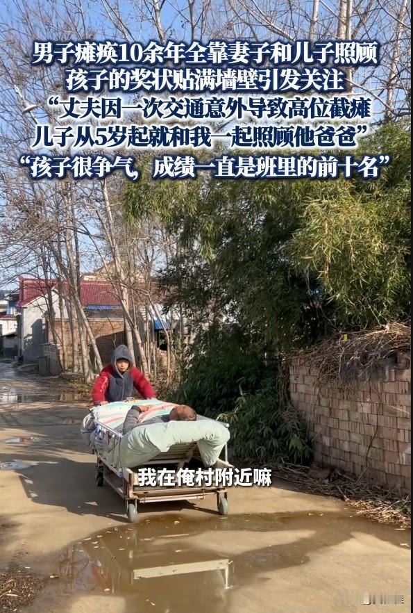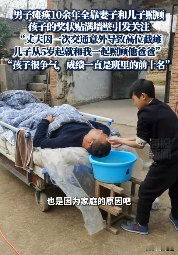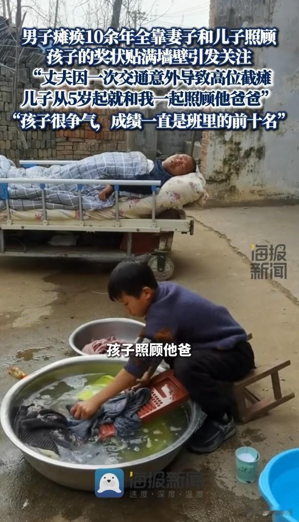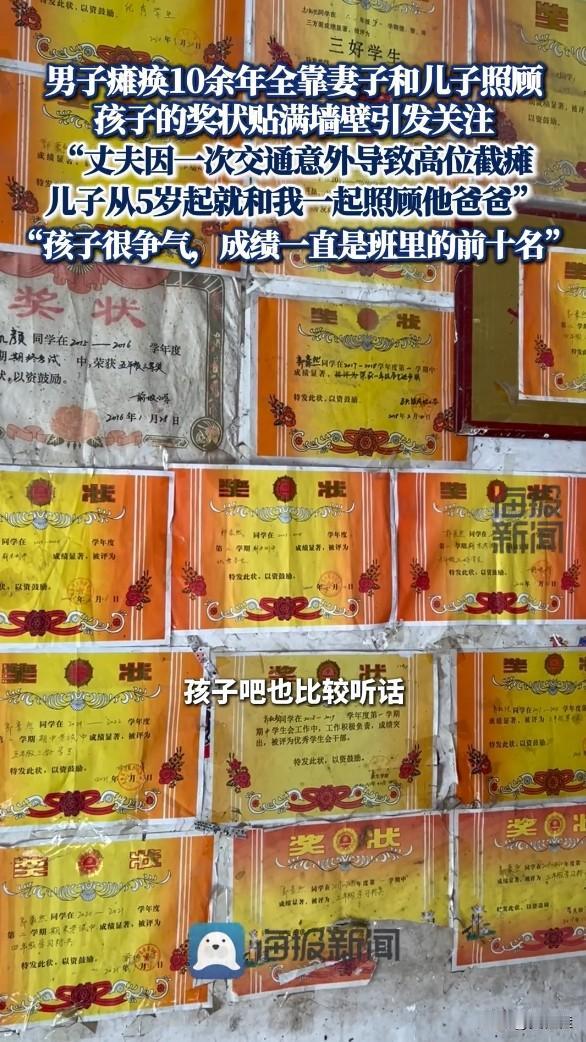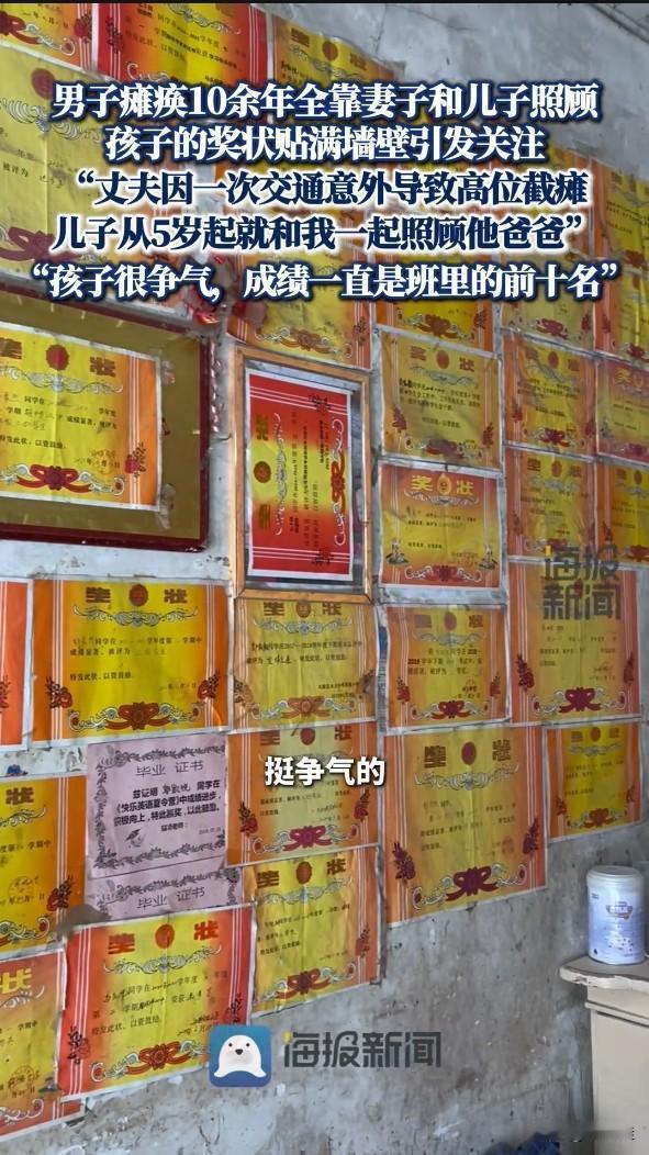太心疼了!画面里的少年本该是无忧无虑的年纪,却早早扛起了家庭的重担。父亲因交通意外高位截瘫,瘫痪十余年间,他从5岁起就和母亲一起照料父亲的饮食起居:喂饭、擦身、洗衣,这些成年人都觉得繁琐的事,成了他生活的日常。 陋室的墙壁上,满是他的奖状,那是少年用汗水换来的荣光,母亲说他成绩始终稳居班级前十名,懂事又争气。一边是需要时刻照护的父亲,一边是不能落下的学业,他硬是在两难的夹缝里,交出了一份让人既心疼又敬佩的答卷。 生活以痛吻他,他却报之以歌。这个小小身板里藏着的坚韧,比满墙奖状更耀眼,愿这份懂事能被温柔以待,愿少年前路有光,未来顺遂。