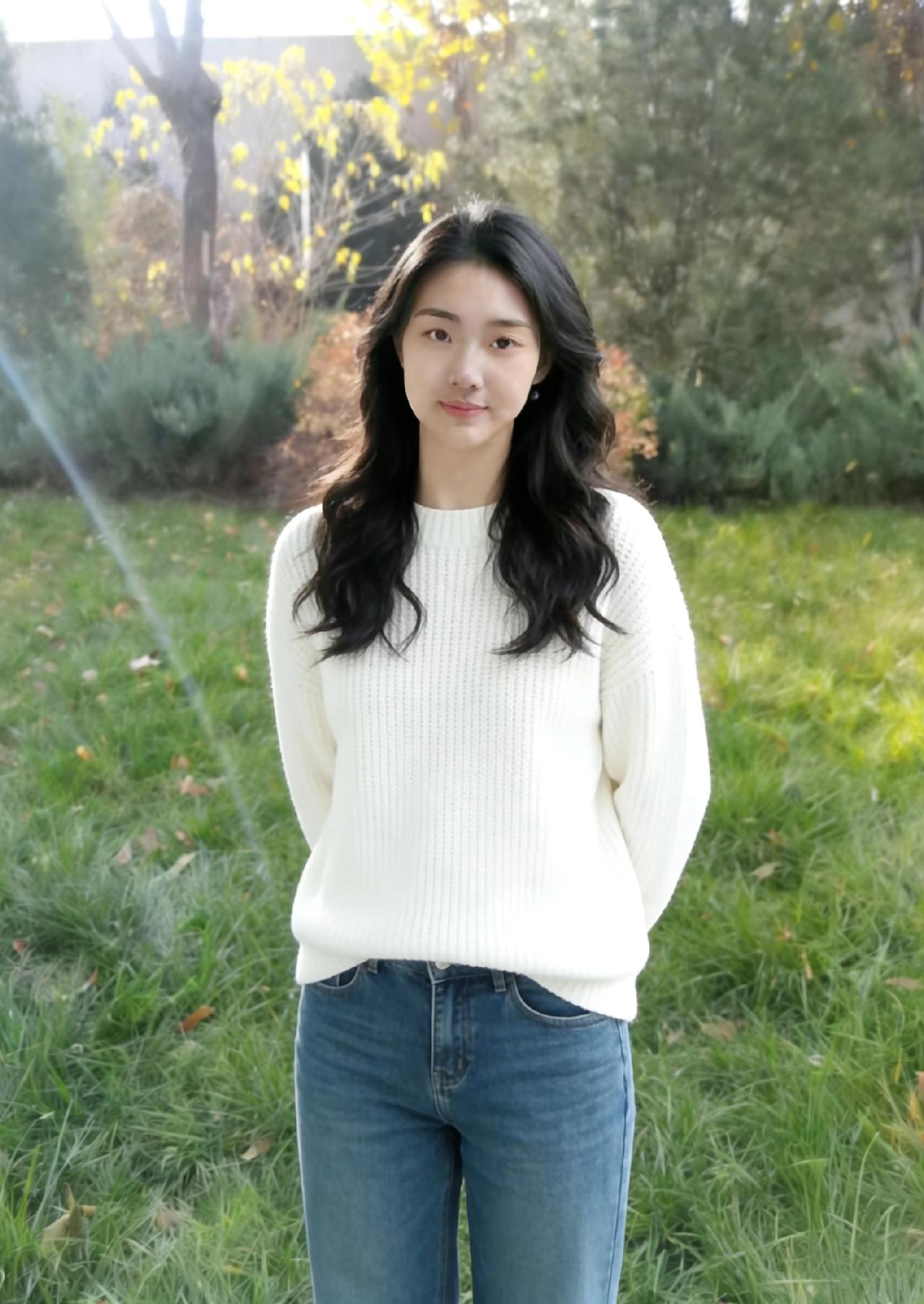 疏林晴日草芊芊,倩影亭亭立陌前。 针衫漫随云影动,长发垂肩晓露鲜。 眸含秋水澄千顷,态胜春兰秀一川。 不用丹青描秀色,天然风骨自娟娟。