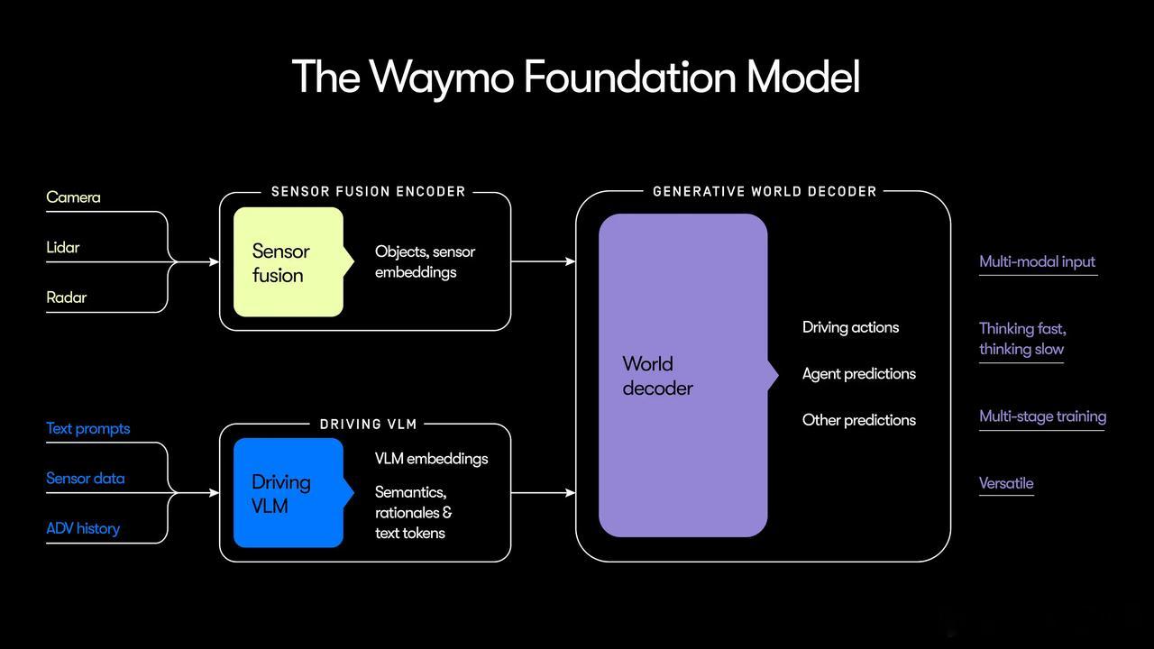 Waymo 发布技术文章聚焦 “可验证的安全”,与行业热议的商业化、规模形成差异化路线。它未押注纯端到端大模型,而是基于统一基础模型,构建了含 “驾驶员” 模型、模拟器和评价系统的闭环生态。通过 “快思考 + 慢思考” 双架构解决实时决策与复杂场景推理,再以 “教师 - 学生模型” 实现能力落地,搭配真实数据驱动的学习飞轮,避免风险隐性累积。