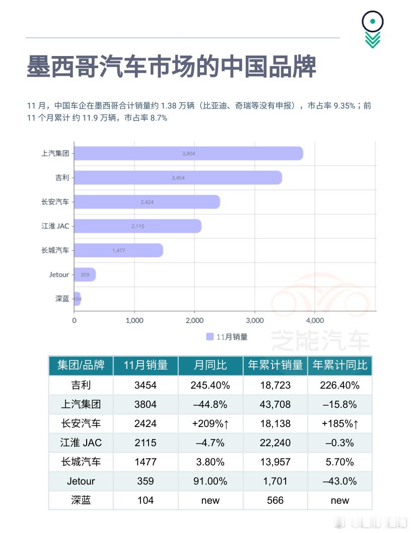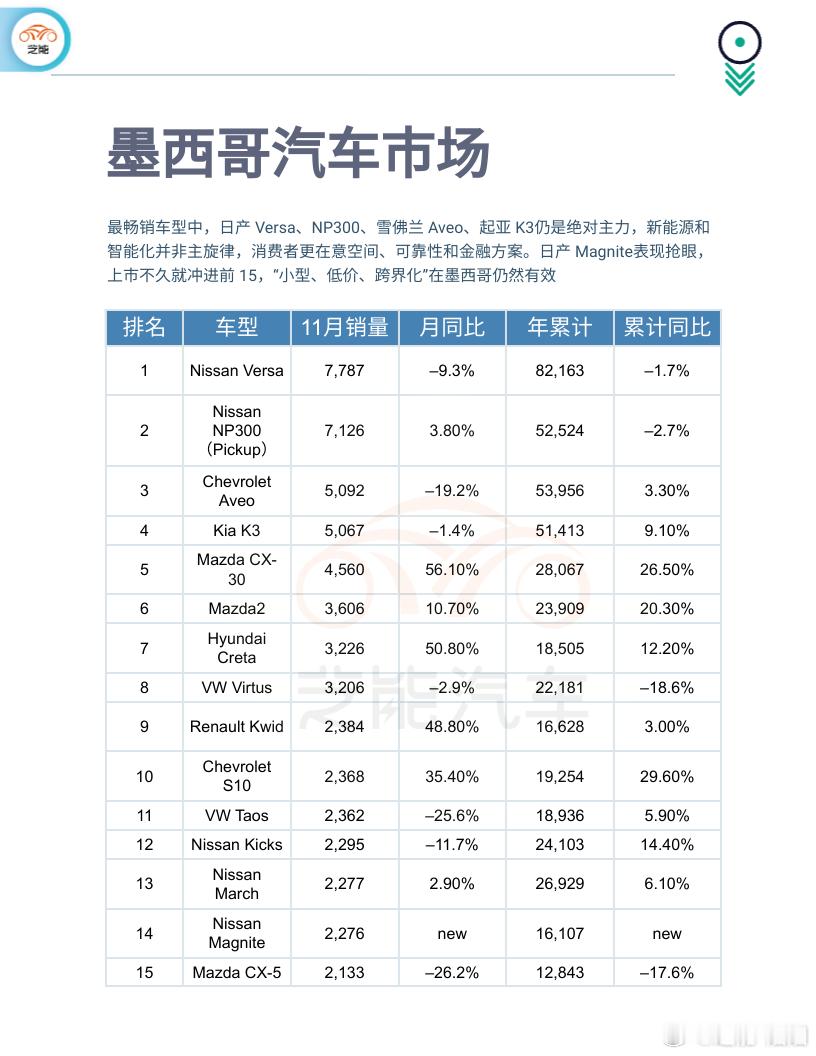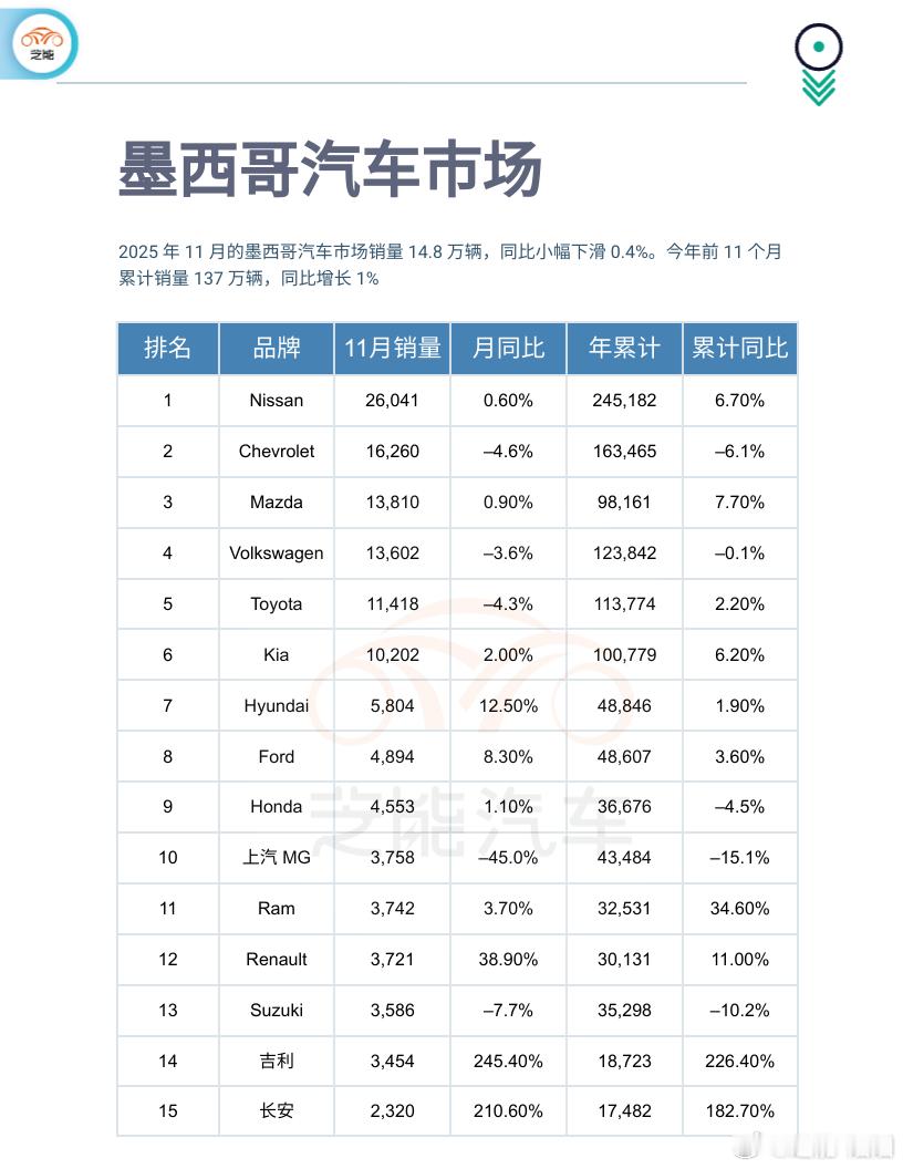 墨西哥是全球颇具规模的汽车市场,2025 年销量整体小幅波动,累计保持微增。这里长期由日系主导,日产稳居榜首,马自达近期销量创新高跻身前三,消费者更青睐耐用、高性价比车型,新能源并非主流。中国品牌表现亮眼,吉利、长安增速迅猛,逐渐从有存在感迈向市场竞争者,仅部分品牌有短期调整。中国零部件企业已多有布局,只是政策影响不容忽视,这个连接北美与拉美的市场,后续值得持续关注~
