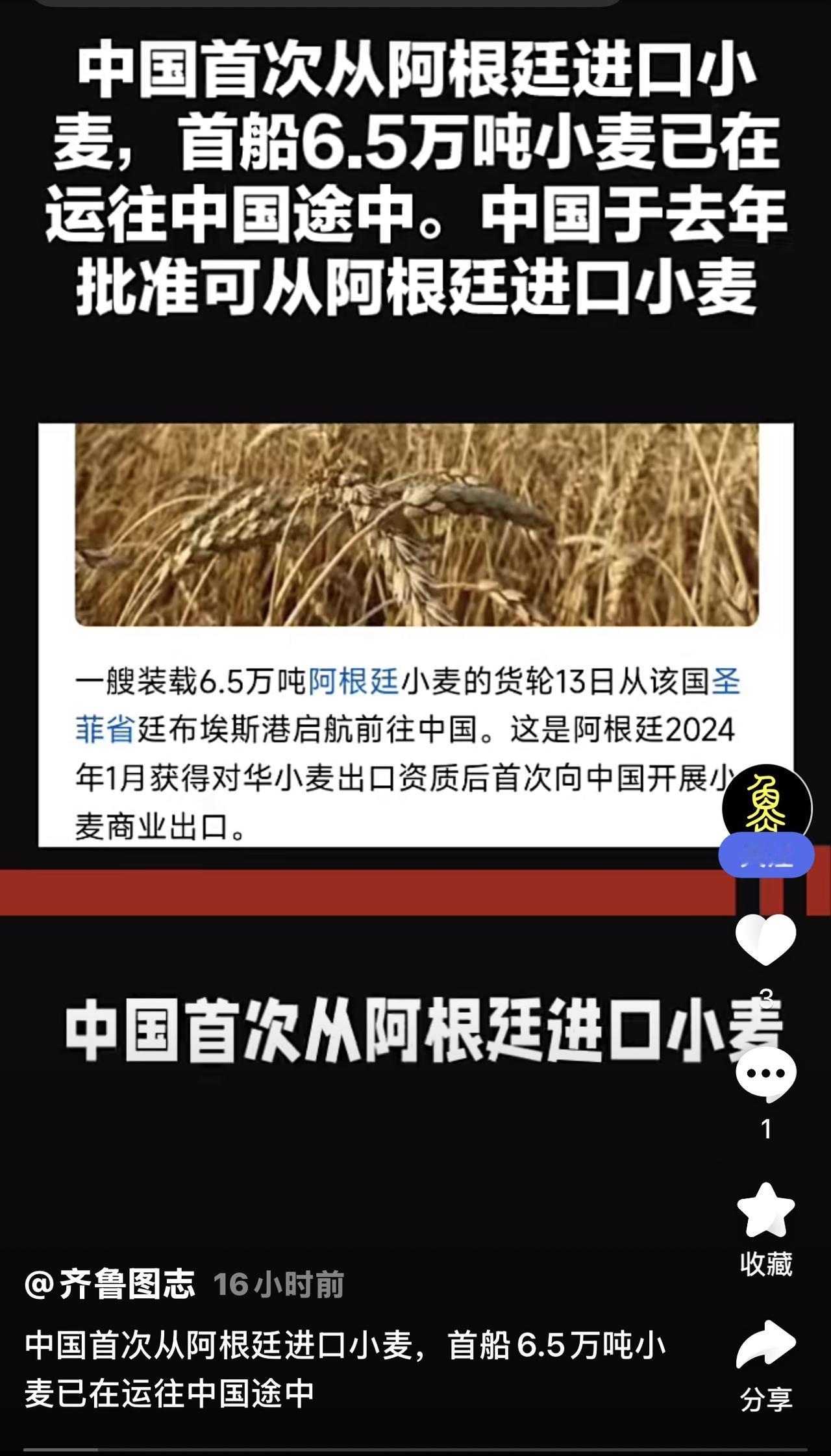 中国数十年来首次采购阿根廷小麦 此次采购由中粮集团执行,这将是自1990年代以来首次有阿根廷小麦运往中国;也反映了在中美贸易摩擦背景下,中国正加大对南美农产品的进口力度。