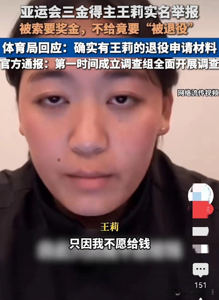 体育界又出丑闻了? 亚运会三金得主实名举报领导, 因领导向自己索要15万元的比赛奖金未果,自己长期被边缘化、被排挤、被打压,这些自己还都觉得无所谓,可能是领导看平时的“打压”并不奏效,直接背着她提交了《退役申请》,强迫让她退役! 此举纯粹是在葬送一个运动员的职业生涯,运动员投诉无门只能选择“鱼死网破”,在网络实名举报! 目前,官方已经介入! 现在评论区大概有两种观点: 有人说运动员训练比赛全靠国家供养,取得成绩理应和上级一起分享!也有人说运动员多数都是伤病缠身,用自己健康换取成绩荣誉,这份成绩和荣誉不仅仅属于自己,既然荣誉已经共享,那奖金不该被剥夺! 你支持哪种观点?