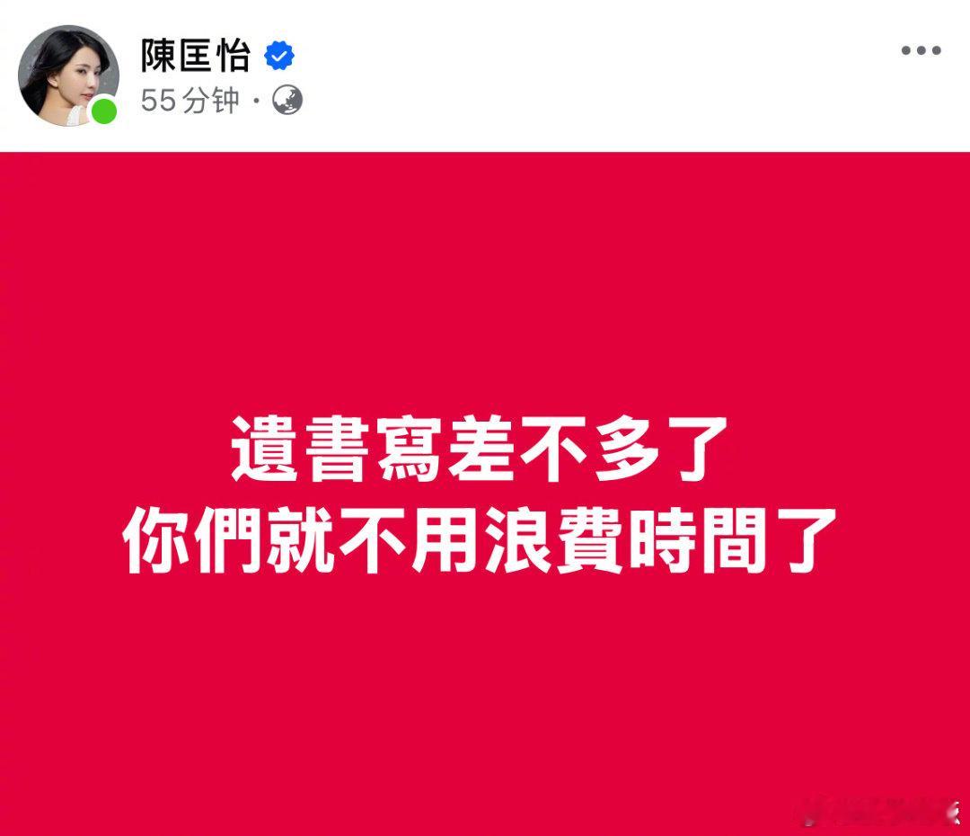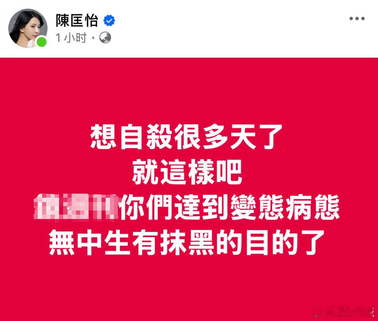 陈匡怡发文陈匡怡 遗书写差不多了 近日,台媒指陈匡怡穿“薄纱勾引大学学长”引发系列热议,对此陈匡怡在社交平台连续发布疑似轻生言论。她写道 “想自杀很多天了”“遗书写差不多了,你们不用浪费时间了”,情绪状态令人揪心。据悉,陈匡怡曾担任周杰伦、王力宏 MV 女主角,凭借《我可能不会爱你》中 Maggie 一角被观众熟知,早年还自曝曾被陈柏霖、张孝全追求。近年她多处于半隐退状态,2024 年曾因当众换衣引发精神状态争议,此次深陷舆论风波后,极端言论让网友纷纷呼吁 “请一定珍惜生命”“希望能有人及时陪伴”。