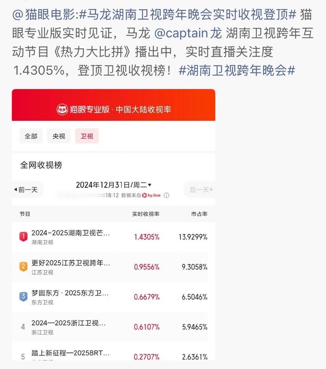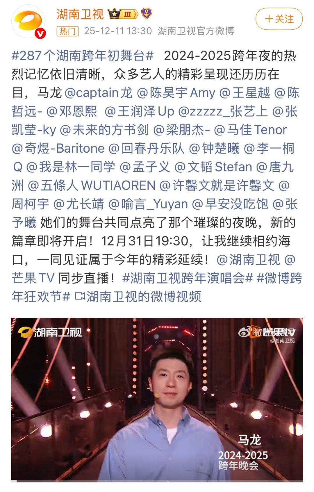 好想念去年湖南跨年没有强猫所难卖艺,但是排面给很大,舞台布景也超级美还紧跟时事用上了老瓦杯的图,专门布置了串场环节让小马在舞台上打球,小马还贡献了同一时段最高卫视直播关注度今年都放在第一个回顾了就不考虑再请一次吗