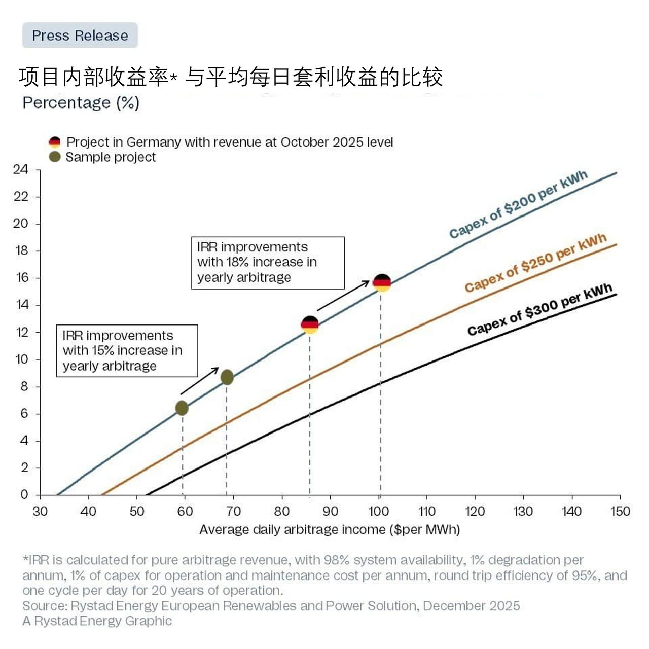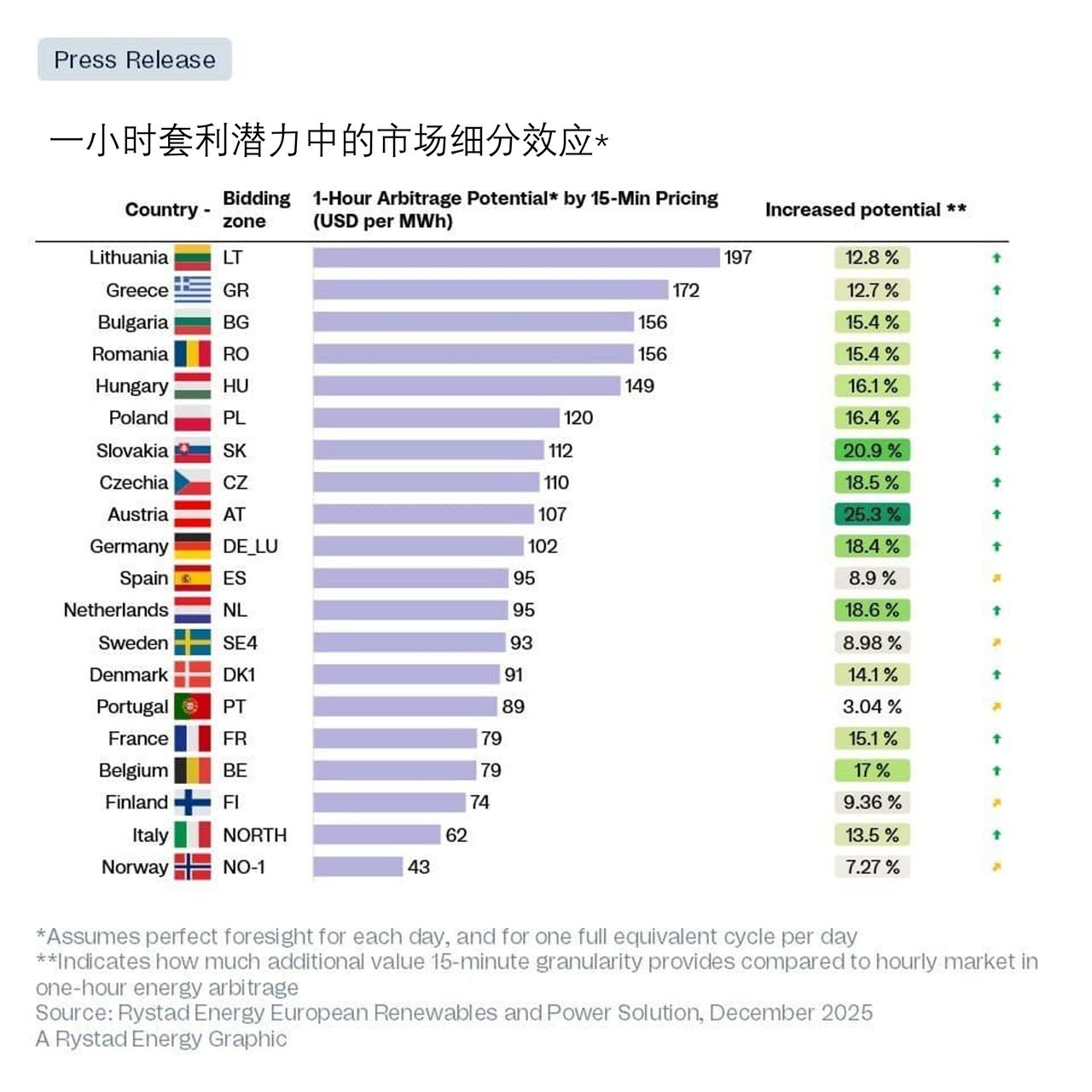 电力定价新机制将推动欧洲电池储能繁荣吗? 根据Rystad Energy公司的分析,自欧盟于 10 月调整电力定价结构以来,欧洲电池储能系统(BESS)的经济效益呈现出更为乐观的态势。多个国家的电池储能系统盈利有望增长超过 15%。新的欧盟系统每 15 分钟设定一次电价,而非每小时设定一次,这为电池储能系统的运营商提供了更多机会,在电价低时购入电力,在电价上涨时售出电力。自新系统实施以来,欧洲各电力市场的套利潜力平均提高了 14%。一些国家,如奥地利和斯洛伐克,收益超过 20%,而其他一些国家,包括葡萄牙、挪威和瑞典,仅有小幅改善。如果电池每年因这种价格波动而多赚约 20%,那么其 20 年内的总投资回报率可以提高约 3%。 传统上,欧盟的电价是每小时设定一次。然而,当市场从每小时交易模式转变为每 15 分钟的交易模式(即 15 分钟市场时间单位,简称 MTU),即从每小时交易转变为每 15 分钟交易时,就出现了新的盈利机会。在 10 月份,当欧洲的日前电力市场从每小时交易模式转变为每 15 分钟 MTU 时,它实现了每 15 分钟的能源交易,结果证明这种交易方式比一整小时的交易更有利可图。例如,在立陶宛,将能源在 15 分钟内转移能赚取约每兆瓦时(MWh)263 美元,比每小时交易多 14%。在德国,每 15 分钟的套利交易比每小时套利交易更有利可图,高出 16%。 Rystad Energy公司储能领域高级分析师塞佩尔·索尔塔尼表示:“在电力生产和消费灵活性较差的国家,可再生能源占比过高可能会导致电价出现大幅波动。风能或太阳能发电量的快速变化意味着电价甚至在单个小时内也会有明显波动。较短的 15 分钟交易时段能够捕捉到这些快速变化,从而为灵活的资产创造了更多机会。相比之下,在电力供应具有灵活性的地区,比如拥有水电的挪威和拥有水电及天然气的葡萄牙,一小时内电价更为稳定。因此,15 分钟交易和小时交易之间的利润差异要小得多。” Rystad Energy公司的分析对比了在欧洲电力市场中,两种情景下进行 1 小时能量套利的潜在利润情况。在 15 分钟交易时段的情景下,一次套利周期需要进行四次充电和四次放电操作。而在 60 分钟交易时段的情景下,同样的周期只需一次充电和放电操作。结果表明,缩短交易时段能够为欧洲储能运营商增加盈利机会。 然而,有一个重要的注意事项。当前异常高的套利利润(每兆瓦时约 150 美元)预计在未来 10 到 20 年内不会持续存在。更现实的长期平均值约为每兆瓦时 60 美元,这意味着纯粹的能源套利的内部收益率(IRR)约为 6%。市场细化程度的提高可能会将平均收入提升至每兆瓦时约 70 美元,从而使内部收益率增加约 3 个百分点。 塞佩尔·索尔塔尼认为:“通过套利方式赚钱所面临的最大挑战在于价格波动难以预测。在欧洲,15 分钟交易时段仅在两个月前才开始。然而,在澳大利亚,从 30 分钟交易时段改为 5 分钟交易时段是在 2021 年,此后,更细的交易时间间隔一直提高了套利收益。” 例如,在澳大利亚的新南威尔士州,实行 5 分钟定价模式后,每年的套利收入比之前的 30 分钟定价模式高出约 20%。在维多利亚州,过去四年里,5 分钟价格模式为 1 小时套利带来的收入比之前的模式高出约 15%。 最终,套利机会可以作为评估储能系统项目潜在最大收益的有用指标。然而,一旦考虑到诸如效率损失、系统可用性、市场流动性以及能够减轻对一次性极端价格波动依赖的套期保值策略等因素,日前市场的实际套利收益将会降低。
