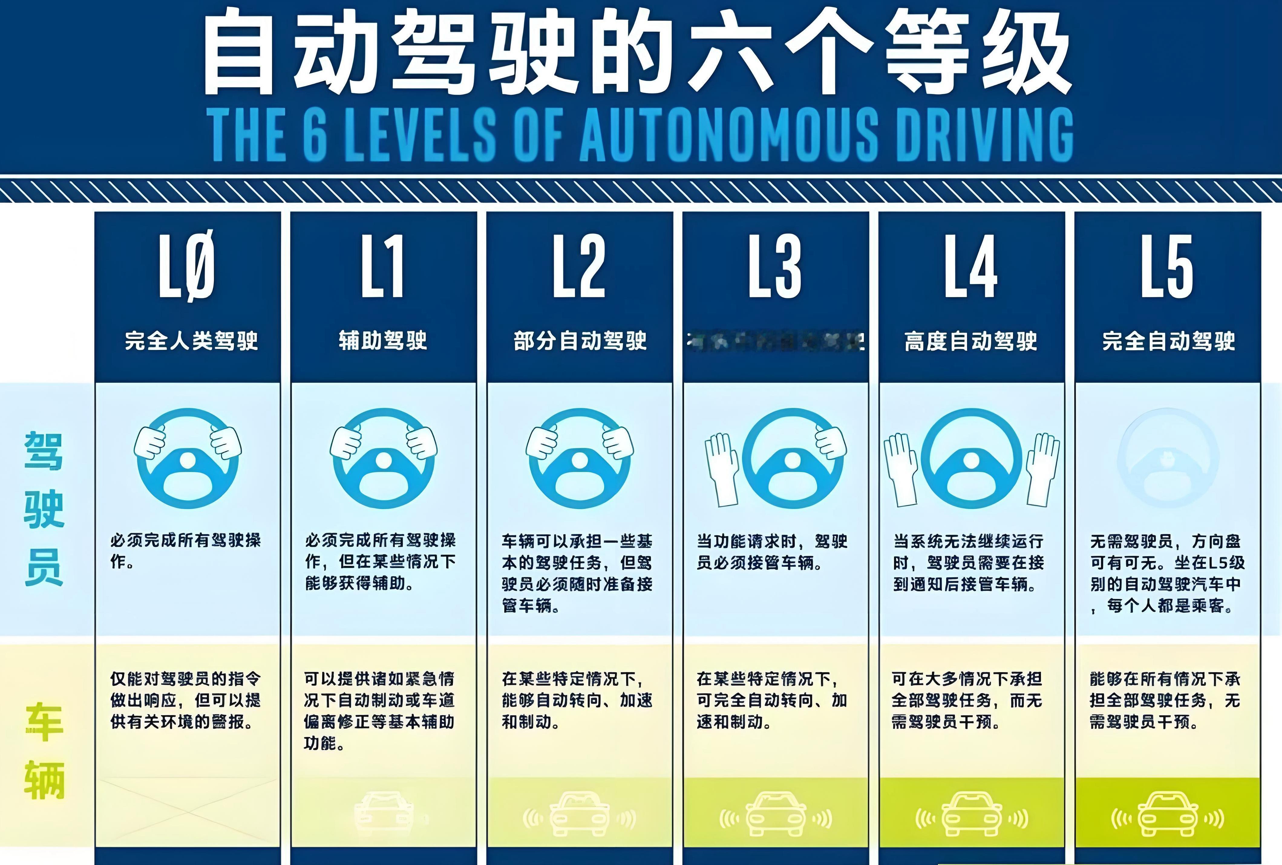 我国首批L3自动驾驶车型获准入许可 这一南一北两家车企是谁?工信部正式公布我国首批L3级有条件自动驾驶车型准入许可,两款分别适配城市拥堵、高速路段的车型将在北京、重庆指定区域开展上路试点,标志着我国L3级自动驾驶从测试阶段迈入商业化应用的关键一步。这次公布的两款车型,来自一南一北两个汽车生产厂家。重庆这家汽车企业生产的纯电动轿车,可以实现在交通拥堵环境下高速公路和城市快速路单车道内最高时速50公里的自动驾驶功能,目前该功能仅限在重庆市有关路段开启。而北京的这家汽车企业生产的这款纯电动轿车,可以实现高速公路和城市快速路单车道内最高时速80公里的自动驾驶功能,目前该功能仅限在北京市有关路段开启。给大家科普下,L3 全称叫“有条件自动驾驶”,并不是完全的自动驾驶。 汽车的自动化分级最早来自美国汽车工程学会SAE。具体分级图中都有,好理解,就是手脚眼。L3也分高速和城区,L3也是需要及时接管的,L3和L2最大技术区别在于安全性上要有足够的冗余和备份。