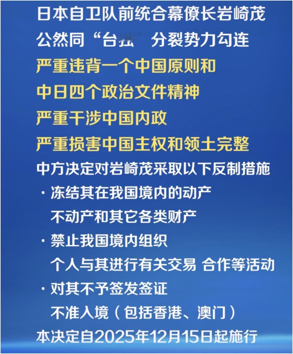 日本自卫队前统合幕僚长岩崎茂公然与“台独”分裂势力勾连,这一行为严重违背了一个中国原则和中日四个政治文件精神,严重干涉中国内政,严重损害了中国的主权和领土完整。日本涉台战略