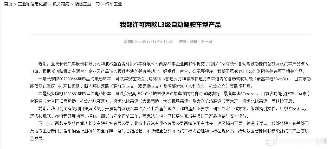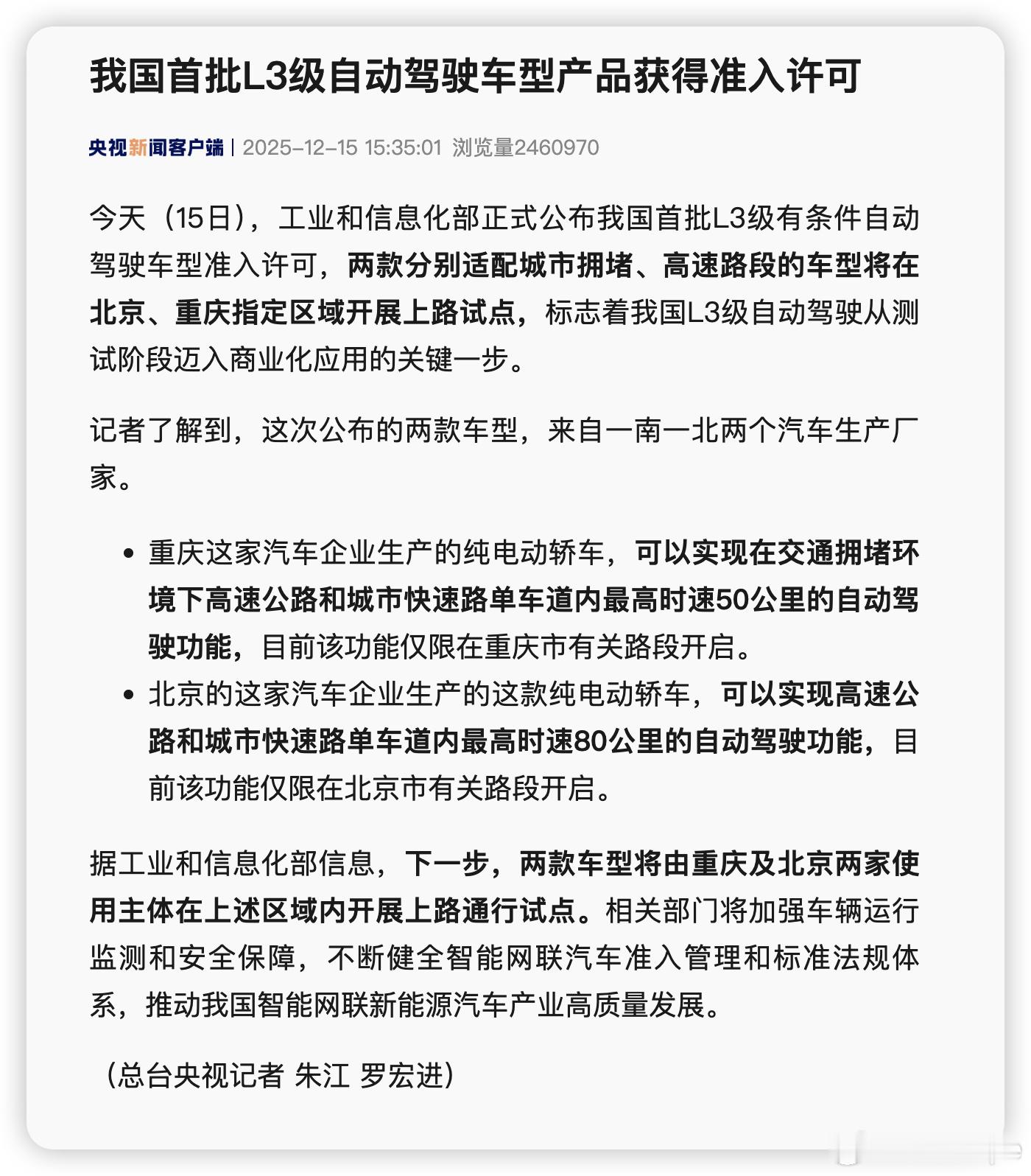 我国首批L3自动驾驶车型获准入许 自动驾驶“持证上岗”!L3时代真的来了✨工信部正式发放L3准入许可,长安、极狐一南一北率先领跑,这下智能驾驶不再是纸上谈兵👏深蓝SL03重庆拥堵路段稳护航,50km/h轻松应对通勤高峰;极狐阿尔法S6北京高速显实力,80km/h解锁高效出行虽目前仅限指定路段试跑,不能全域畅开,但这份“准生证”意义远超想象——标志着自动驾驶从封闭测试迈入真实路况公测,商业化落地又近一大步🚗💨技术落地从不是一蹴而就,先在复杂车流里打磨完善,真正的“解放双手”才会更稳更靠谱行业里程碑已立,后续值得期待!🌟L3智能汽车新突破新能源汽车分享每一天大v聊车智能化驾驶L3自动驾驶l3级自动驾驶深蓝SL03重庆