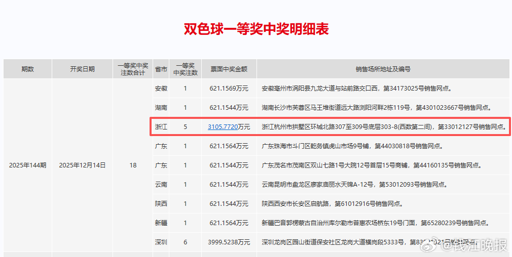 【#杭州有人中了3105万# 】 3105万!杭州中出了双色球大奖!中奖彩票售出于杭州市拱墅区环城北路307至309号底层303-8(西数第二间),第33012127号福彩销售网点。12月14日晚,双色球第2025144期开奖。全国共中出单注奖金621万元的一等奖18注,分别出自:浙江(5注)安徽(1注)湖南(1注)广东(2注)云南(1注)陕西(1注)新疆(1注)深圳(6注)。浙江这5注一等奖出自一张彩票,被杭州幸运儿揽获。此外,我省购彩者还收获单注奖金15.1万元的二等奖16注(绍兴6注、杭州、嘉兴各5注)。本期双色球销量3.79亿元,筹集公益金1.36亿元。下期一等奖奖池金额27.36亿元。(潮新闻 实习生 蒋雨萱)