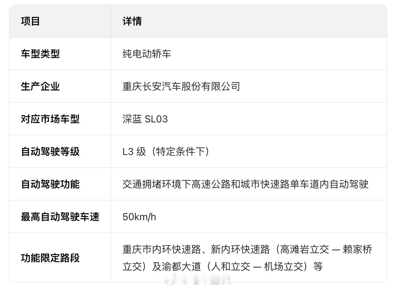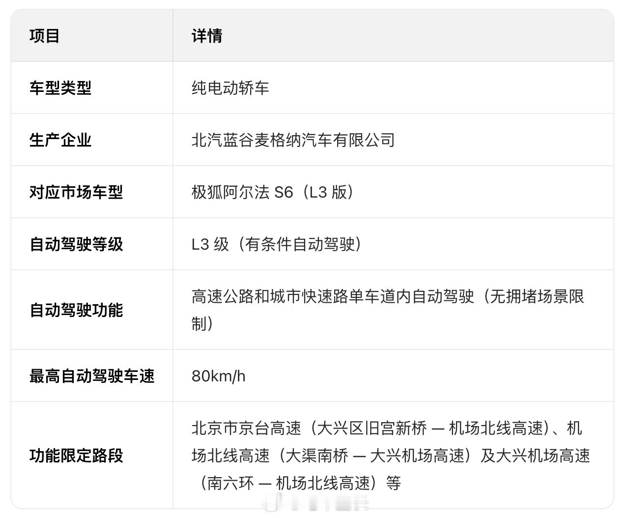 【我国首批L3自动驾驶车型获准入许可】L3自动驾驶将在京渝上路试点 两款分别适配城市拥堵、高速路段的车型将在北京、重庆指定区域开展上路试点这次公布的两款车型,来自一南一北两个汽车生产厂家北京的这家汽车企业生产的这款纯电动轿车,可以实现高速公路和城市快速路单车道内最高时速80公里的自动驾驶功能,目前该功能仅限在北京市有关路段开启。——这家是北汽极狐,车型极狐牌BJ7001A61NBEV,阿尔法S6。重庆这家汽车企业生产的纯电动轿车,可以实现在交通拥堵环境下高速公路和城市快速路单车道内最高时速50公里的自动驾驶功能,目前该功能仅限在重庆市有关路段开启。——这家是长安,长安牌SC7000AAARBEV,也就是深蓝 SL03。