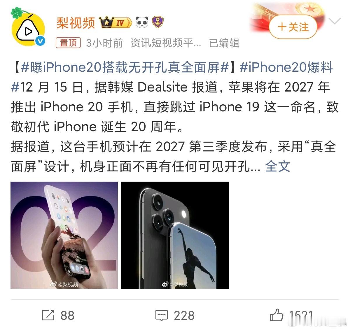 iPhone20爆料iPhone18都不知道是什么情况,就开始预热iPhone20了?这不是超前点播吗?现在开始遇到这个手机,那谁还会买iPhone18呀,跳过了19命名,等20出来,感觉18低人两等的存在。但是改成这个名字也是因为20周年的原因,10周年的时候,苹果正式进入全面屏时代,加入刘海和Face ID,目前传闻说20周年的时候,苹果将干掉打孔,还有两年时间,大家觉得这种可能性大吗?