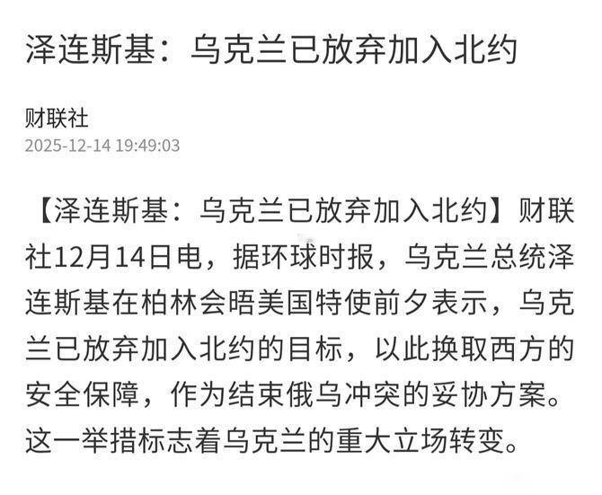 终究是黄梁一梦!乌克兰放弃加入北约 满盘皆输!演员总统表示,乌克兰已放弃加入北约的目标,以此换取西方的安全保障,作为结束俄乌冲突的妥协方案。 本来没有事的,硬往事上钻。几百万人莫名其妙的做了炮灰,还不自知。都说21世纪全球经济一体化,不太可能发生战争,可乌克兰结结实实的给人们上了一课,原来还可以这么玩。 乌克兰被打的一点不冤,太平日子过久了,就觉得活着没意思,非要主动过鸡飞蛋打的日子,把人牙都笑掉了,搞不懂,好端端的没病没灾的要去加入北约干什么,加入北约能成仙啊!这不是没事找事吗! 人死绝了,也不值得同情,可怜之人必有可恨之处,是他自己主动找事的,愿谁。有的人就是闲的慌,太平日子过久了,就总想找点乐子,结果把自己玩死了。千里无鸡鸣,白骨露于野,哀鸿遍野,这怪谁。 天天喊独立自由,前苏联解体后,你乌克兰不是已经独立了吗,还独立什么?至于自由就更是扯淡,难道有谁用绳子拴着你了,你不自由。非得加入北约才自由。全世界都知道北约就是为了对付俄罗斯而成立的,你加入北约、俄罗斯不打你打谁。 脑子让驴给踢了,让人看笑话,把我们牙都差点笑掉的了。乌现状 乌克兰 西方乌克兰联盟 北约 北约战略失败 北约对乌援助 北约战略破产