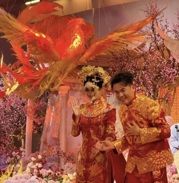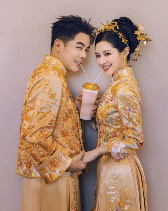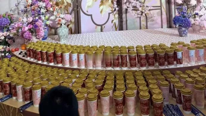 霸王茶姬创始人张俊杰与天合光能联席董事长高海纯婚礼现场摆满奶茶,人手一杯“霸王茶姬”。