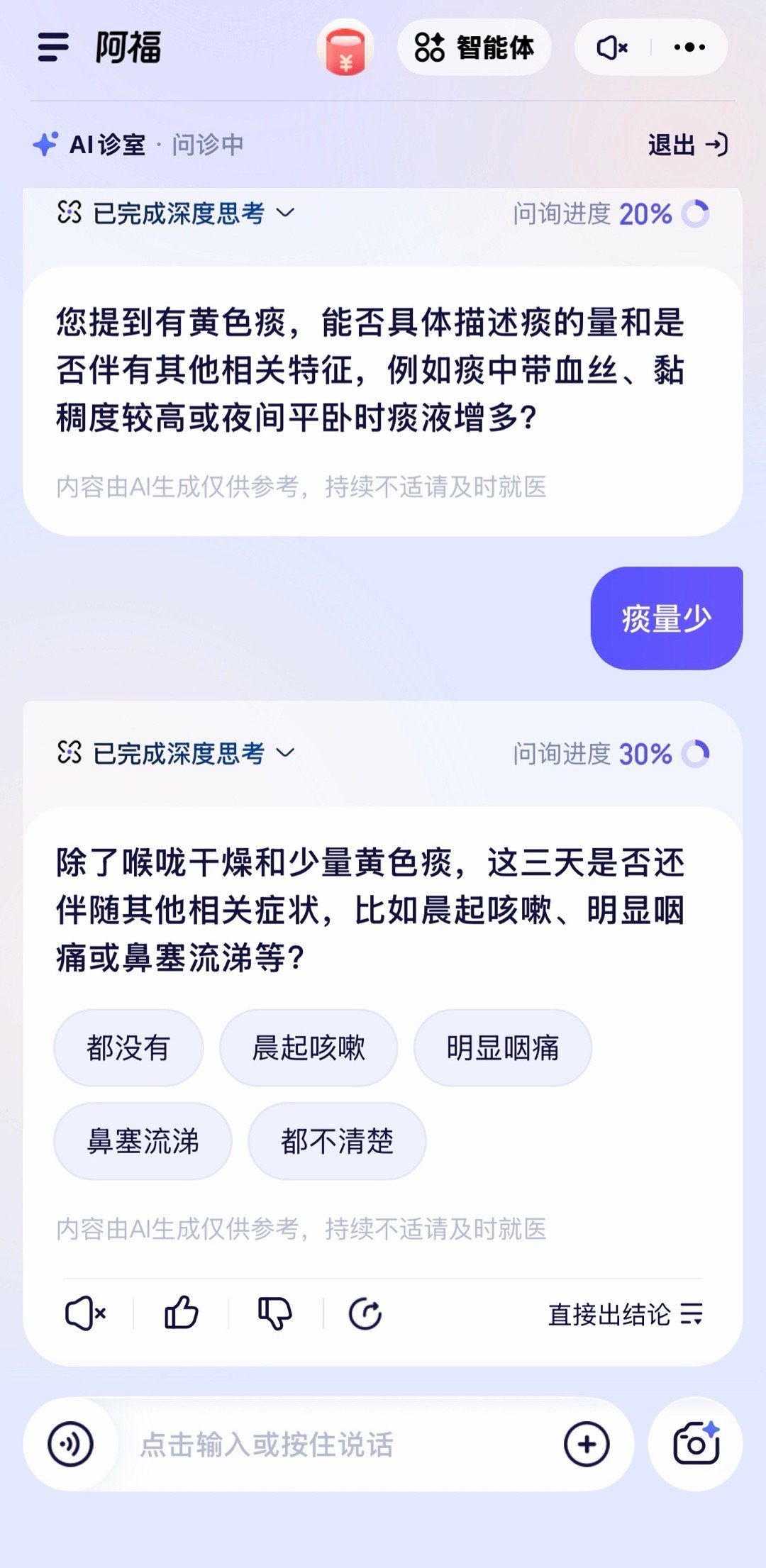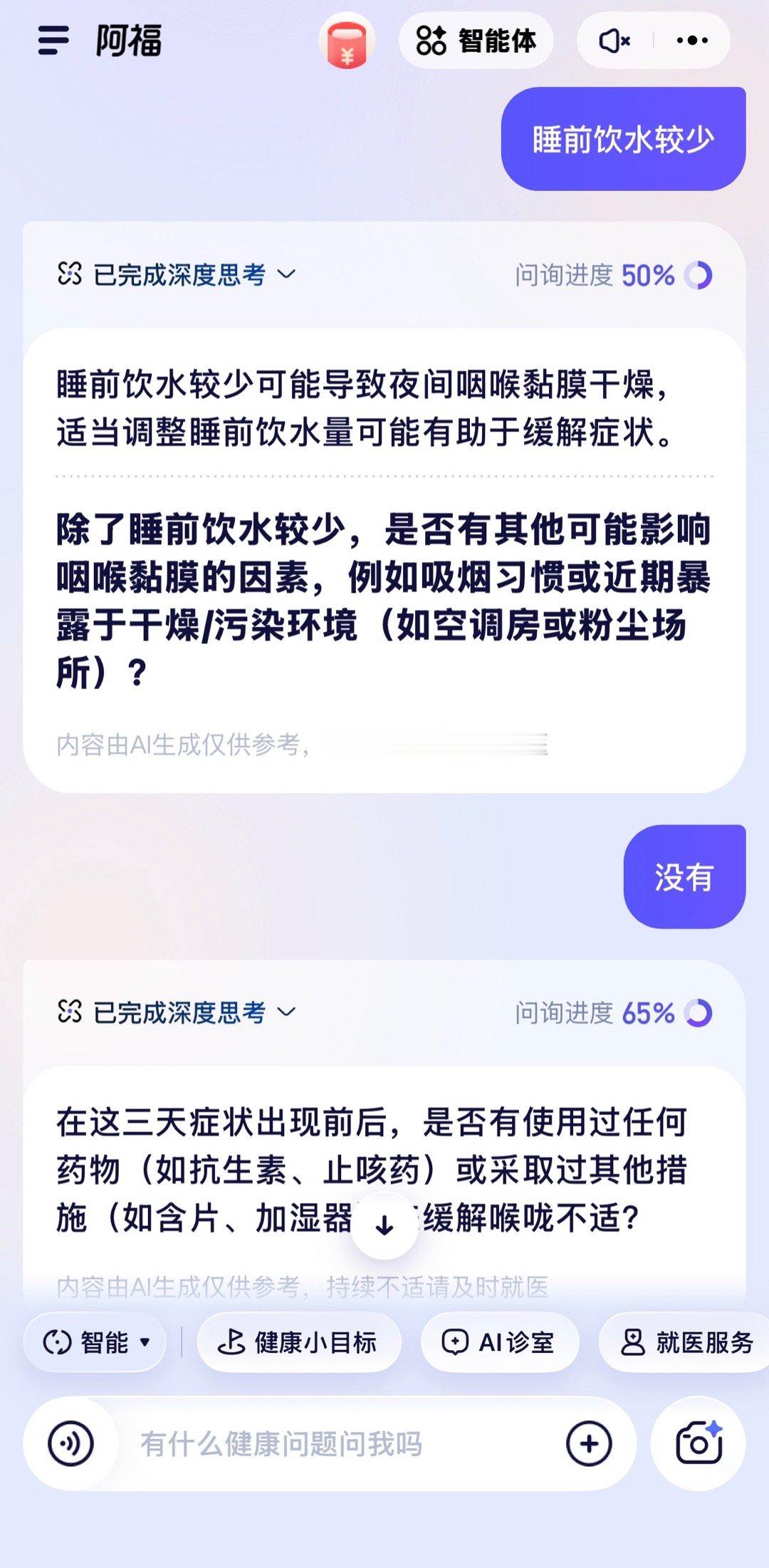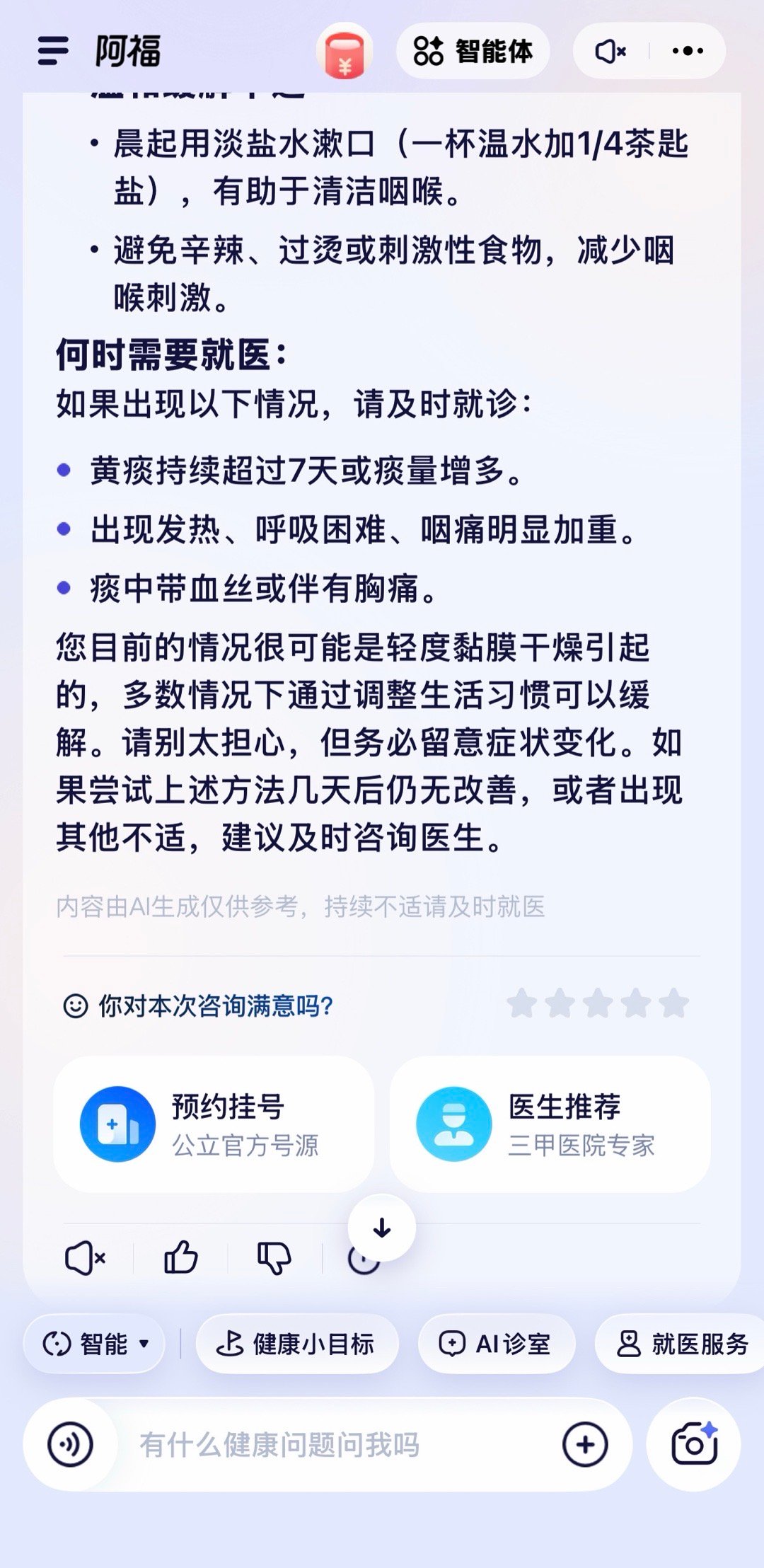 蚂蚁阿福APP月活用户已超1500万 最近天气一直忽冷忽热的,早起嗓子有点不得劲,又不想请病假去医院,又不想乱吃药,最近朋友给我推荐了蚂蚁阿福,说是用起来还不错,正好那天起来就试着问问了,真的有点好用!显示给我分析了嗓子不得劲是因为哪些原因,然后给到我一些生活上的改善建议,而且最后还会给我分析可以怎么处理,真的很安心。还是想问的更清楚的,蚂蚁阿福还有个AI诊室可以继续咨询,当我提出问题后,它会开始追问一些关键的细节,比如说“症状出现多久了?”“是否有逐渐加重的情况”“能否具体描述痰的量,有没有带血丝?”问得很仔细,有点我自己没注意的点,它都能问到,而且给到的回答选项也很具体,一直追问让我可以更全面的了解。根据给到我的建议措施,还能在蚂蚁阿福设置健康小目标提醒我,比如说让我增加睡前饮水,我就能在健康小目标里设置打卡睡前一小时喝水。最贴心的还是会给到我家附近医院的挂号渠道和医生推荐,直接让我省下找挂号渠道的时间,让我省心又省力。AI就是让咱们在去看病前,可以对自己的症状有一个详细的了解,在看医生的时候可以更清楚说出自己的症状,不至于着急漏了哪些细节,让AI来帮你理清状况,在就诊前做好准备。