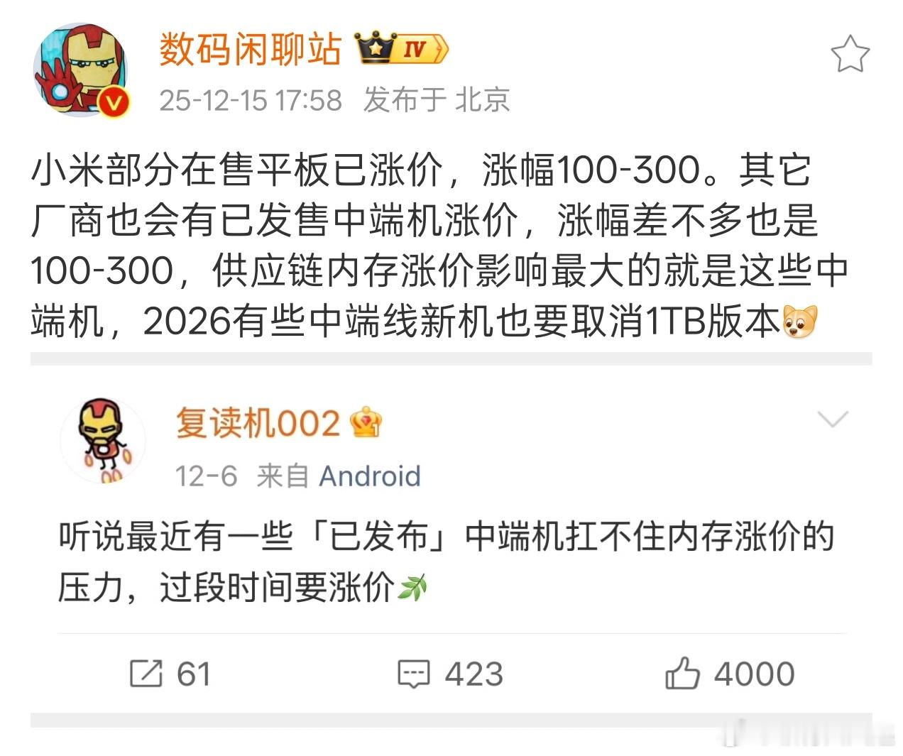 内存涨价已经开始影响在售的产品了,小米多款平板已经涨价