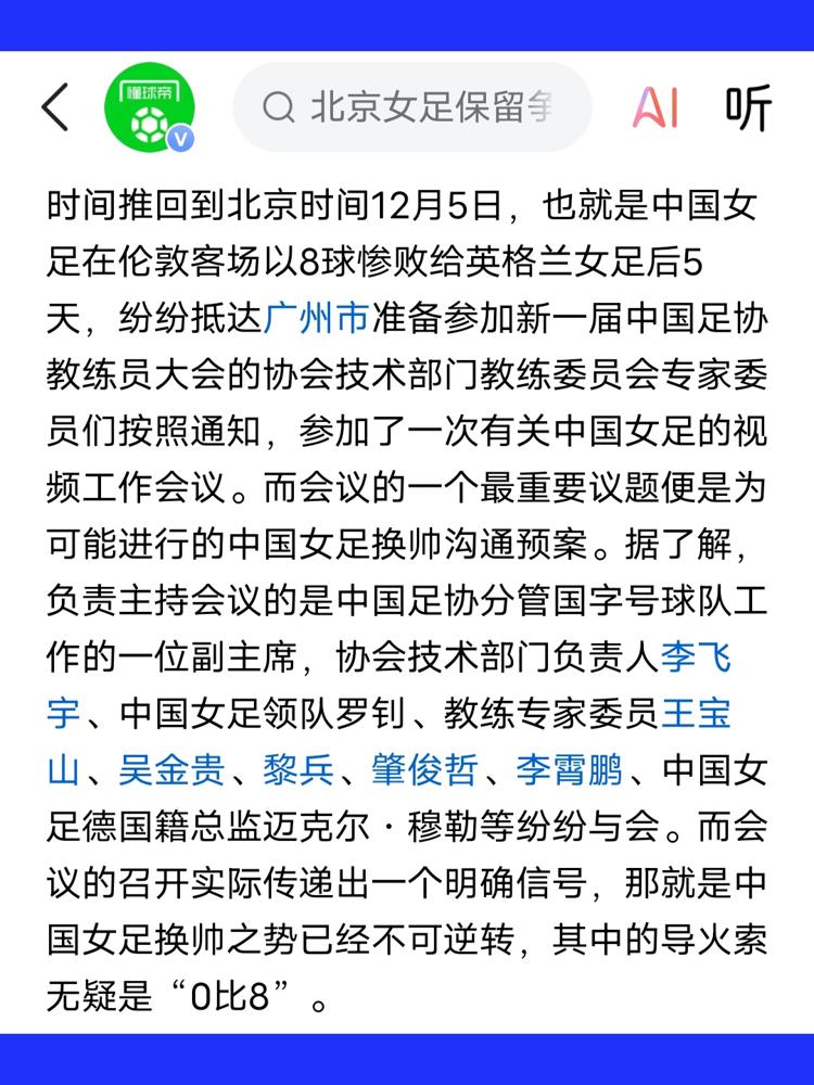 当你看到肇俊哲、李霄鹏、王宝山、吴金贵、黎兵这些人在广州参加决定中国女足主帅的会议时,你有何感想? 所以,陈婉婷果然连被提名拿出来讨论的机会都不给(2021年10月中国女足主帅竞聘,陈婉婷报名截止最后时刻的出现,阻碍了被内定的肇俊哲上位)。 陈婉婷的名字连被端上台面的资格都没有,仿佛她最后时刻的报名,是一根不小心扎进既定程序里的刺,必须被迅速拔掉。 看看围坐在会议桌边的那些面孔,肇俊哲、李霄鹏、王宝山……清一色的男足功勋背景。 由他们来裁定一位女性主教练的命运,本身就充满了微妙的讽刺。 中国女足这块金字招牌,似乎永远绕不开男足体系的影子。 2021年那次竞聘,业内都看好带女足俱乐部打出漂亮足球的陈婉婷,她拥有亚足联职业级教练证书,这在女足教练中凤毛麟角。 可结果呢? 她的出现成了“阻碍”,阻碍了谁? 答案不言自明。 视频会议里,水庆霞那句“我暂时不考虑”透着十足的清醒和疏离。 她太懂这里的游戏规则了,当流程本身都值得怀疑时,最好的态度就是敬而远之。 反倒是远在摩洛哥的常卫魏,那声“服从安排”应得干脆利落。 只可惜,足球场从来不用言语证明什么。 国际足联女足冠军杯的比分牌,1比2,武汉女足败北,让这场原本可能“双喜临门”的任命,瞬间蒙上了一层尴尬的阴影。 我们不禁要问,选拔的标准究竟是什么? 是专业能力,还是人情世故的站队? 中国女足刚刚从谷底挣扎着夺回亚洲杯,姑娘们用汗水拼回来的尊严,难道又要被拖回老路上去吗? 当年贾秀全指导带队在奥运会上遭遇惨败,教训还不够深刻? 那种忽视技术流、片面强调精神意志的粗放模式,已经被证明与世界潮流背道而驰。 陈婉婷执教江苏女足时,球队展现出的地面传控和战术纪律,让多少人看到了中国女足技术化改革的希望。 这些实实在在的成绩,在所谓的“会议讨论”中,其分量难道比不上一张沉默的举手投票? 足协的选帅流程能否真正公开透明,让专业能力成为唯一的度量衡,而不是在小圈子里完成利益的分配。 球迷的眼睛是雪亮的。 大家怀念孙雯那个时代女足的辉煌,更期盼能有一位真正懂女足、有现代足球理念的掌舵人。 中国女足需要的不是一个“服从安排”的管理者,而是一个能点燃全队战术灵魂的领军者。 这次选帅风波,凉了的可能不止是陈婉婷的机会,更是无数人对女足运动改革刚刚燃起的信心。 别再让短视的内耗,透支了玫瑰再次绽放的土壤。