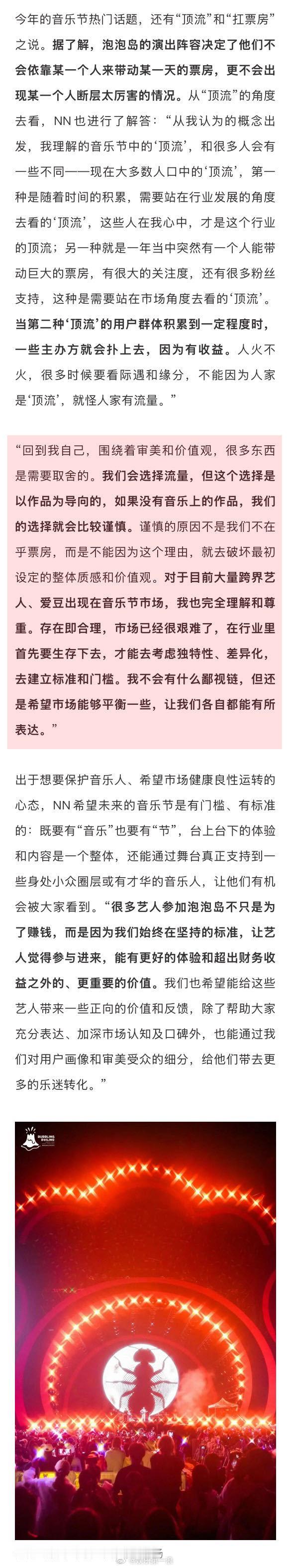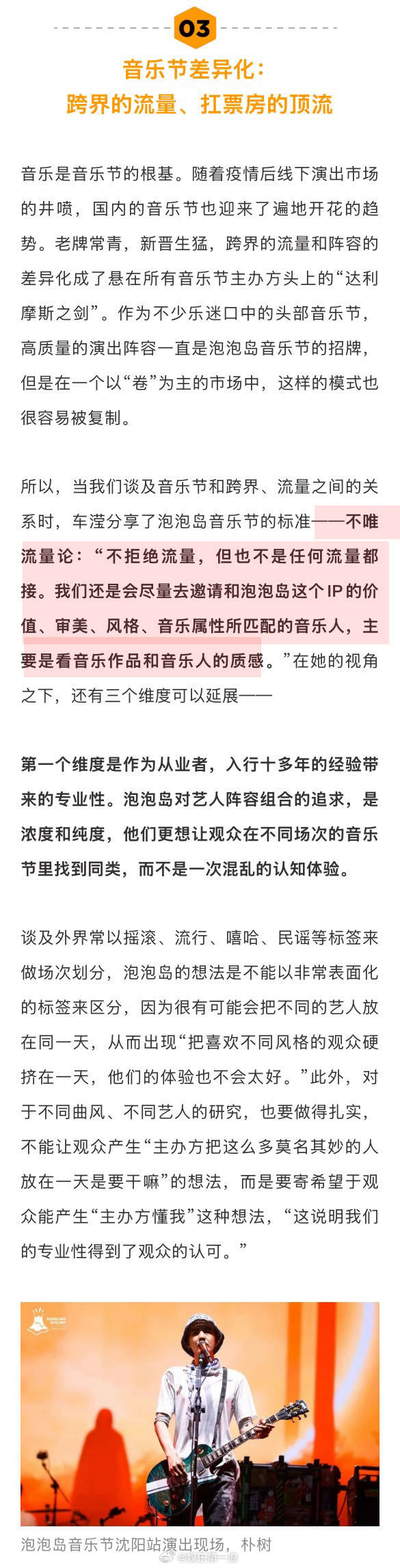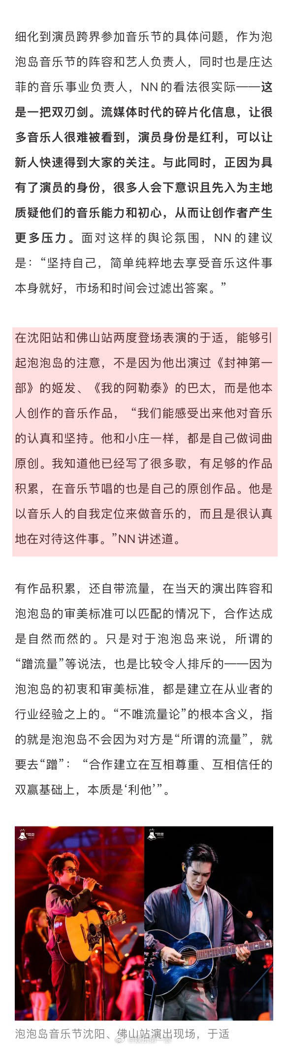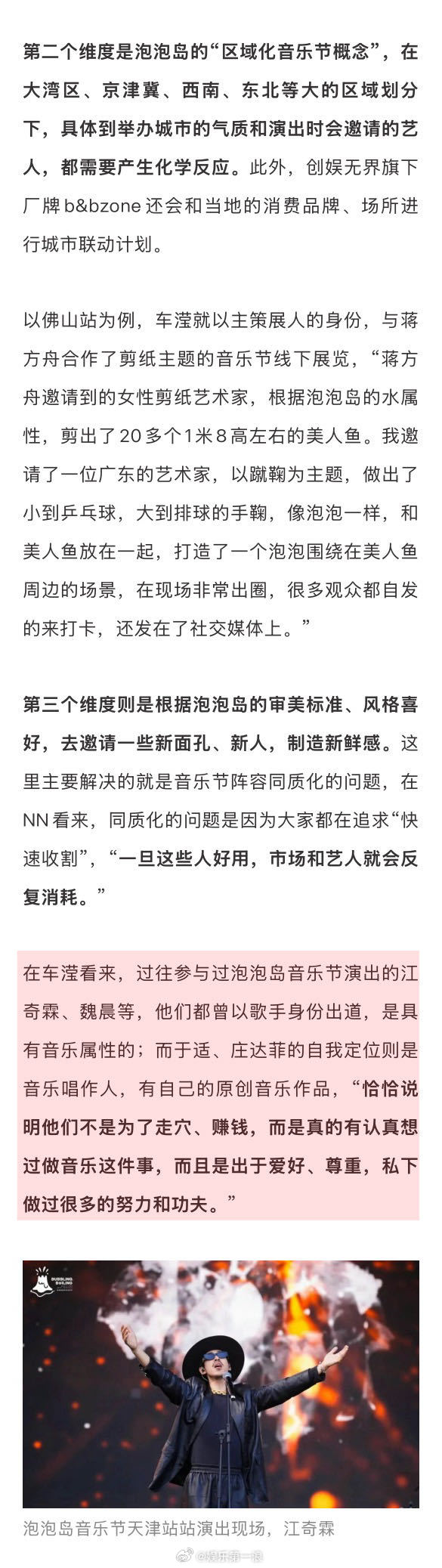 主办方谈音乐节顶流扛票房 主办方谈于适庄达菲上音乐节 在创娱无界合伙人/SVP车滢看来,过往参与过泡泡岛音乐节演出的江奇霖、魏晨等,都曾以歌手身份出道,是具有音乐属性的;于适、庄达菲的自我定位是音乐唱作人,有自己的原创音乐作品,“恰恰说明他们不是为了走穴、赚钱,而是真的有认真想过做音乐这件事,而且是出于爱好、尊重,私下做过很多的努力和功夫。”娱理独家↓