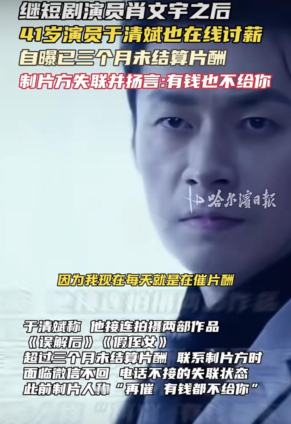 41 岁演员于清斌讨薪这事太闹心了,自曝三个月片酬没结算,制片方还玩失联演员拍戏本就辛苦,从早到晚连轴转,不仅要背台词,还得揣摩角色,好不容易拍完了却拿不到钱。 这也不是个例,之前就有不少演员遇到讨薪难题。这让我想到那些为戏付出心血,最后却被拖欠报酬的人,真心心疼。希望相关部门能加强监管,别让演员流汗又流泪,也盼着影视圈能多些诚信,少些这样的糟心事。 于斌出场费 刘一斌 于宏斌 杨继斌 于锡斌 于清舒 于斌斌