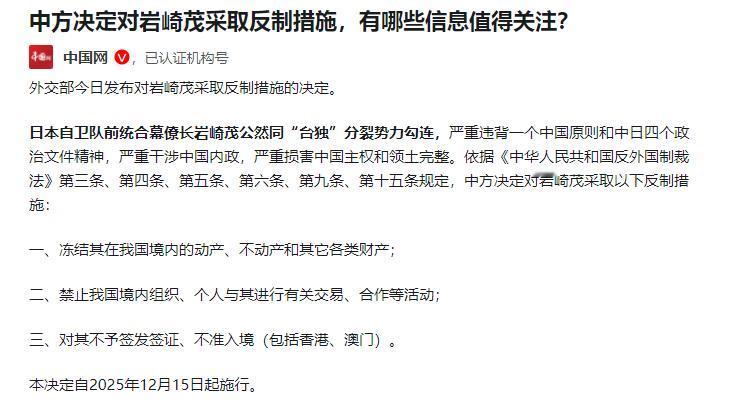 突发消息,中方决定对岩崎茂采取反制措施....... 至于理由则是:日本自卫队前统合幕僚长岩崎茂公然同“台独”分裂势力勾连,严重违背一个中国原则和中日四个政治文件精神,严重干涉中国内政,严重损害中国主权和领土完整。 依据《中华人民共和国反外国制裁法》第三条、第四条、第五条、第六条、第九条、第十五条规定,中方决定对岩崎茂采取以下反制措施。 首先第一个要关注的是,日本的“统合幕僚长”,官有多大?笔者查了下,统合幕僚长负责统筹陆海空三军的联合作战和情报协调。 因此大致相当于“总参谋长”,且在其退役前,还是(空军)上将军衔——这妥妥是位曾位高权重的日本军方大佬级别人物。 那么他到底做了些啥?据日媒《朝日新闻》消息:岩崎茂在退役后,于2025年3月21日,出任了台政务顾问。 须知,也正是在这一天,我们的王外长正在日本进行访问,并跟石破茂会面。 所以这妥妥是作妖之举。自然我外交部就此问题,对日方进行了质问。而日方的态度则是推诿,表示岩崎茂已经退役了,属于“退休人员的私人活动”。 这一幕跟安倍晋三下台后,才口出狂言说“台湾有事就是日本有事”是何其一致。就是经典的日式小动作或擦边球。 你追责,它就说人家退休了,不在职,我管不了。可分明就是奔着恶心人而来的。 其次要关注的是,这位岩崎茂退役后跑到台湾到底干了些啥?笔者查了下,可谓没干一件好事。 比如,以日本前军方最高指挥官的专业背景,指导台当局制定安全政策,点涵盖“F - 16V与日本F - 35的战术协同”,试图将台湾防空网纳入美日“第一岛链”作战体系...... 还比如推动日台情报共享机制化...... 还比如为台当局搭建与日本军事层面的勾连桥梁,为后续更大规模的日台军事合作铺路等等。 这些勾当,难道仅是一个退休人员能干出来的吗?打死笔者也不相信,日本的野心和图谋,已经昭然若揭了! 尤其是再联系高市早苗上台后的那番狂言,显然日本早就偷偷摸摸——起码在石破茂时期,就开始搞起了小动作,而高市早苗无非是掀了桌子。 这也是笔者为何一直说,石破茂对高市早苗的那些激烈批评啥的,我们千万别当真。 石破茂的批评,仅是嫌高市早苗过早暴露出来了日本的野心,认为日本还应隐忍,而不是在否认高市早苗的观点! 最后一个要关注的是,为何如今我们突然出手,要对其进行制裁? 很简单:在局面对我有利的情况下,掌握主动,封堵漏洞,不再给日本何操作空间,压缩模糊化,让一切都在阳光下进行。 同时也给高市早苗之流敲响警钟,过去你们玩的那表面一套背后一套,自此后就不好使了......
