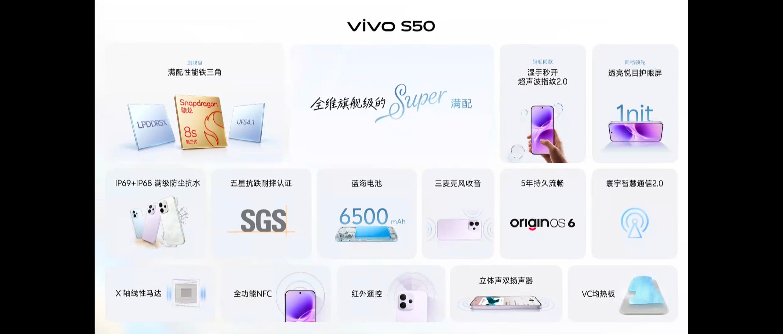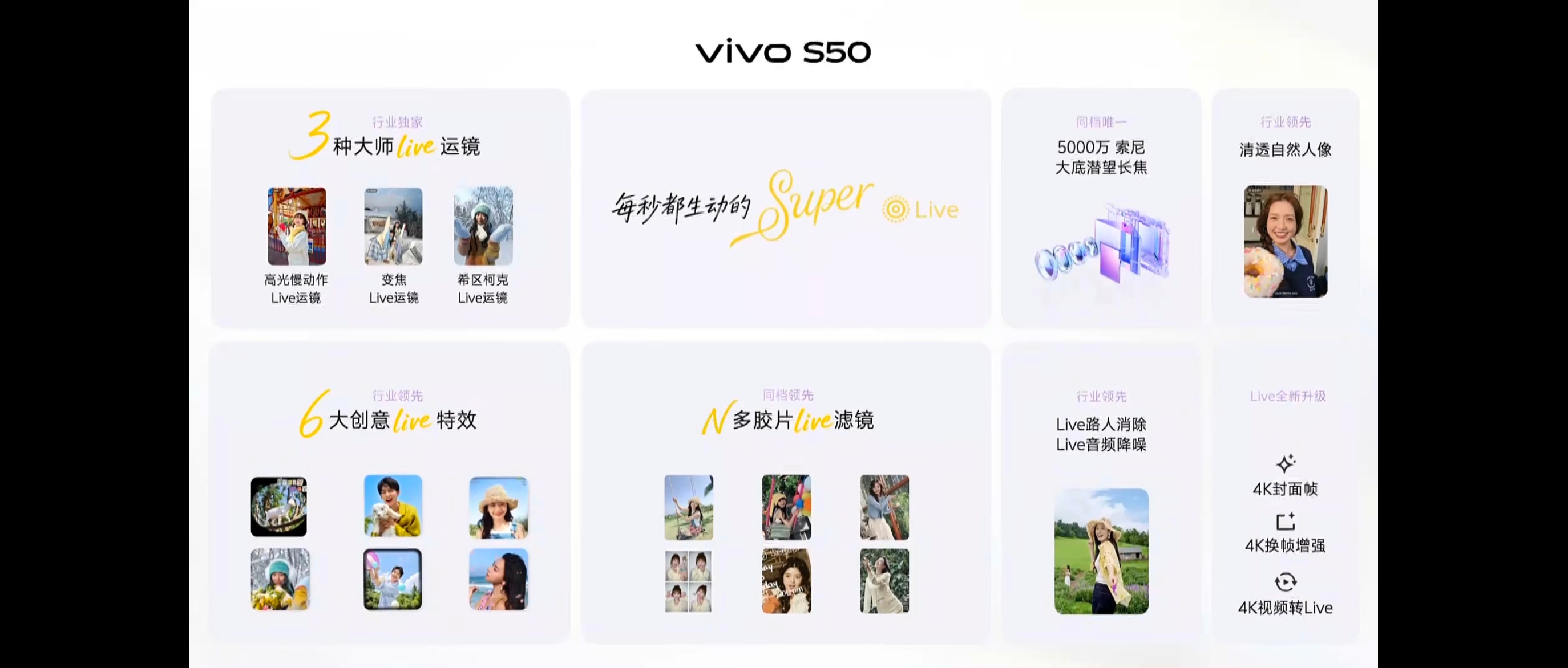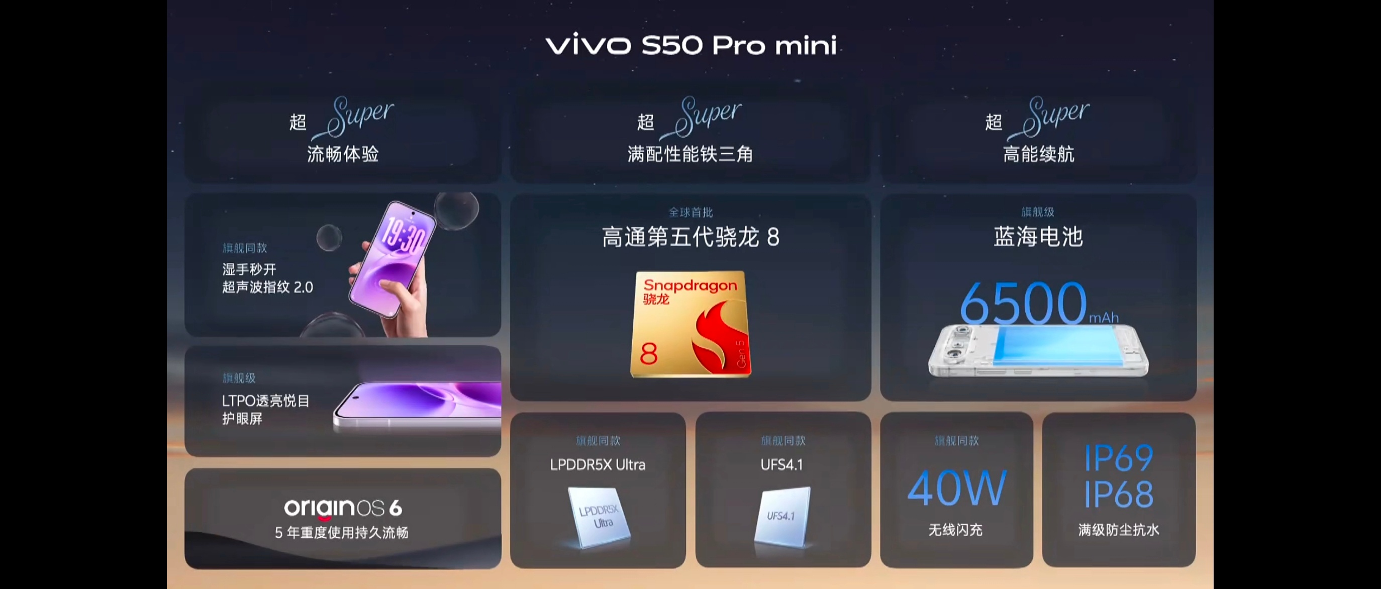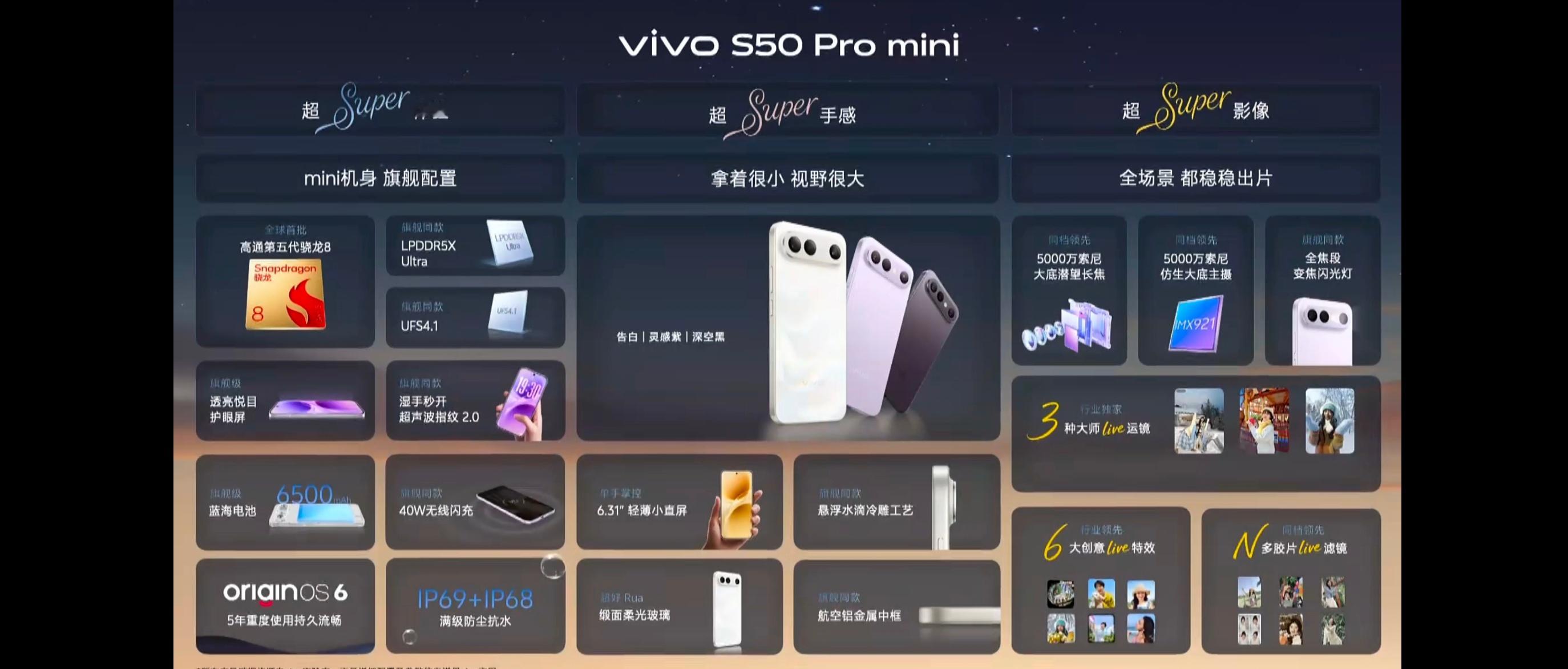 vivo S50 正式发布,主打Live 实况动图玩法搭载第三代骁龙 8s 处理器、索尼 IMX882 传感器、6500mAh 蓝海电池等,2999 元起vivo S50 Pro mini 搭载高通第五代骁龙 8 芯片,并搭配旗舰同款 LPDDR5X Ultra + UFS 4.1,3699元起