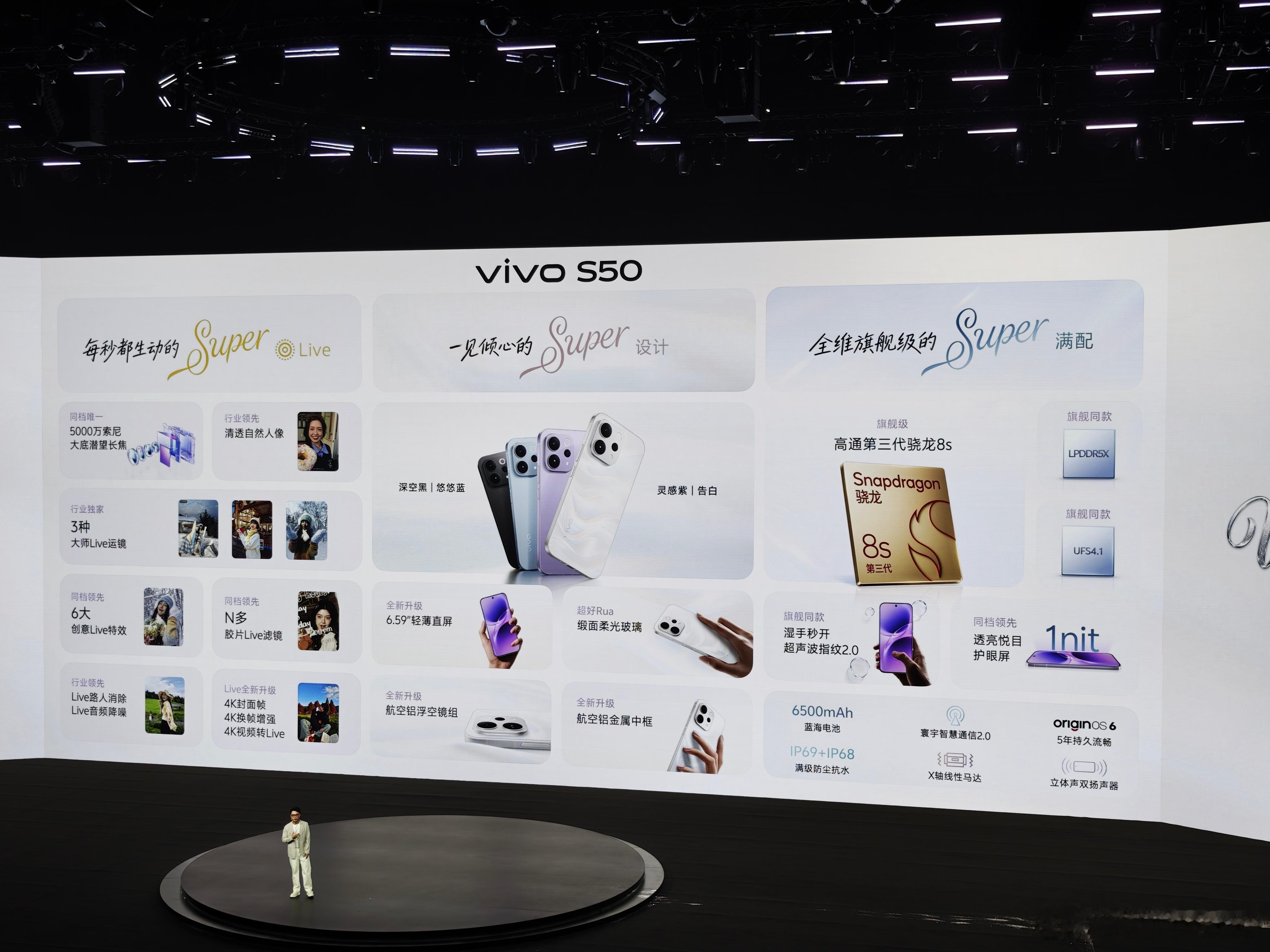vivo S50价格出来了:12+256,299912+512,329916+512,3599骁龙8s Gen3+LPDDR5X+UFS4.1,6.59英寸 2750*1260p 直屏,前置50MP,后置50MP LYTIA 700V OIS主摄+8MP超广+50MP IMX882 OIS潜望长焦,90W+6500mAh,3D超声波指纹,满级防水,双扬等,金属中框+玻璃后盖,157.52*74.33*7.59mm,197g。感觉如何?vivo S50