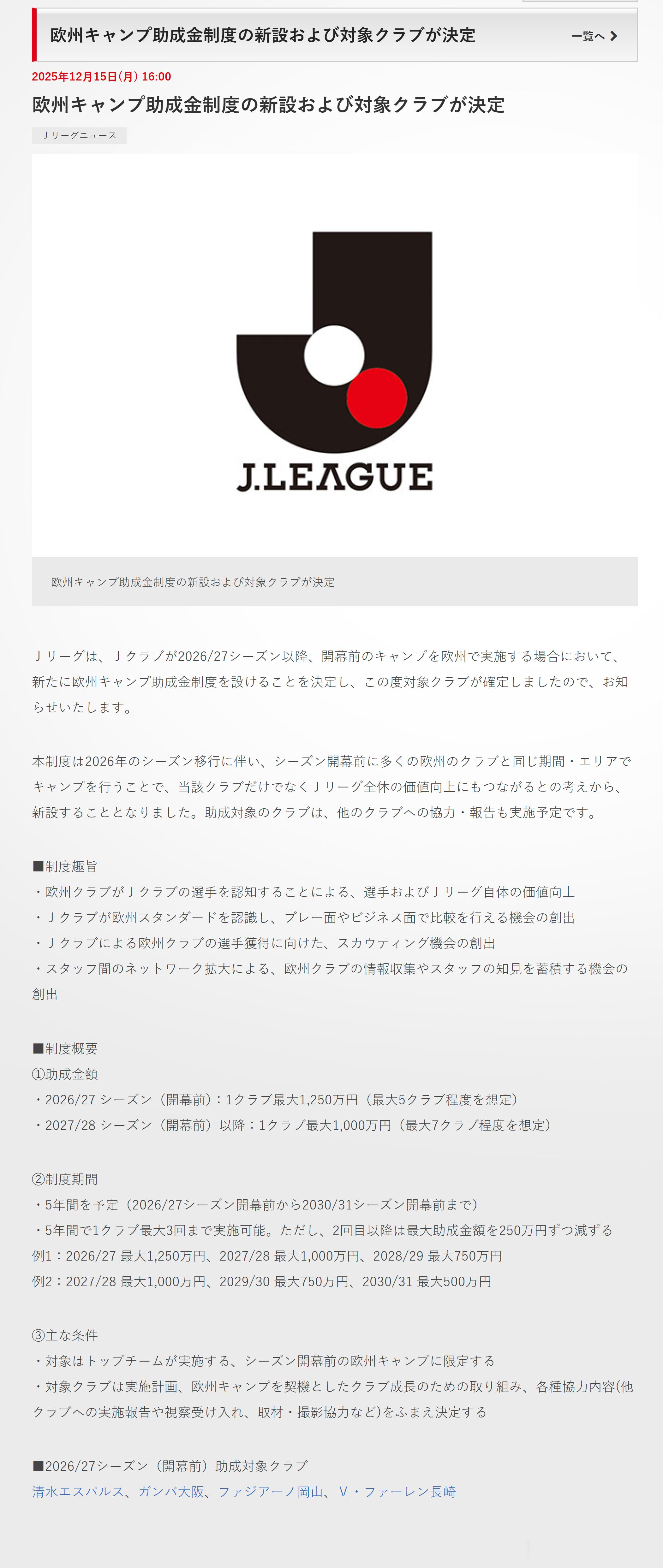 【欧洲集训补助金制度新设及対象俱乐部确定】J联赛决定,为J俱乐部在2026/27赛季以后于赛季开幕前在欧洲实施集训的情况下,新设欧洲集训补助金制度,现已确定対象俱乐部,特此通报。本制度是为配合2026年赛季过渡,在赛季开幕前与众多欧洲俱乐部在同一时期、同一地区进行集训,从而不仅提升相关俱乐部本身,还能带动整个J联赛价值提升的考虑而新设。获得补助的俱乐部预计还将向其他俱乐部进行合作与报告。■制度宗旨・通过欧洲俱乐部对J俱乐部球员的认知,提升球员及J联赛本身的整体价值・为J俱乐部提供认识欧洲标准的机会,并在比赛水平及商业层面进行比较・为J俱乐部创造面向欧洲俱乐部球员引进的球探机会・通过扩大工作人员间的网络,创造收集欧洲俱乐部信息及积累工作人员见识的机会■制度概要①补助金额・2026/27赛季(开幕前):每俱乐部最高1,250万日元(预计最多5家俱乐部左右)・2027/28赛季(开幕前)以后:每俱乐部最高1,000万日元(预计最多7家俱乐部左右)②制度期间・预计为5年(从2026/27赛季开幕前至2030/31赛季开幕前)・5年内每俱乐部最多可实施3次。但第2次以后每次最高补助金额递减250万日元例1:2026/27最高1,250万日元、2027/28最高1,000万日元、2028/29最高750万日元例2:2027/28最高1,000万日元、2029/30最高750万日元、2030/31最高500万日元③主要条件・対象限于顶级球队实施的赛季开幕前欧洲集训・対象俱乐部将综合考虑实施计划、以欧洲集训为契机的俱乐部成长举措、各项合作内容(向其他俱乐部报告实施情况、接受视察、配合采访及拍摄等)予以确定■2026/27赛季(开幕前)补助対象俱乐部清水S-Pulse、Gambe大阪、Fagiano岡山、V・Varen長崎