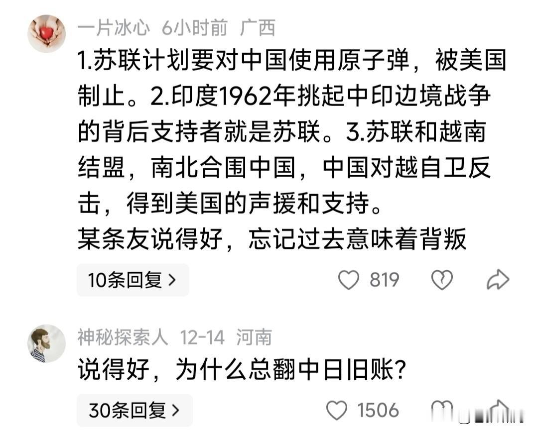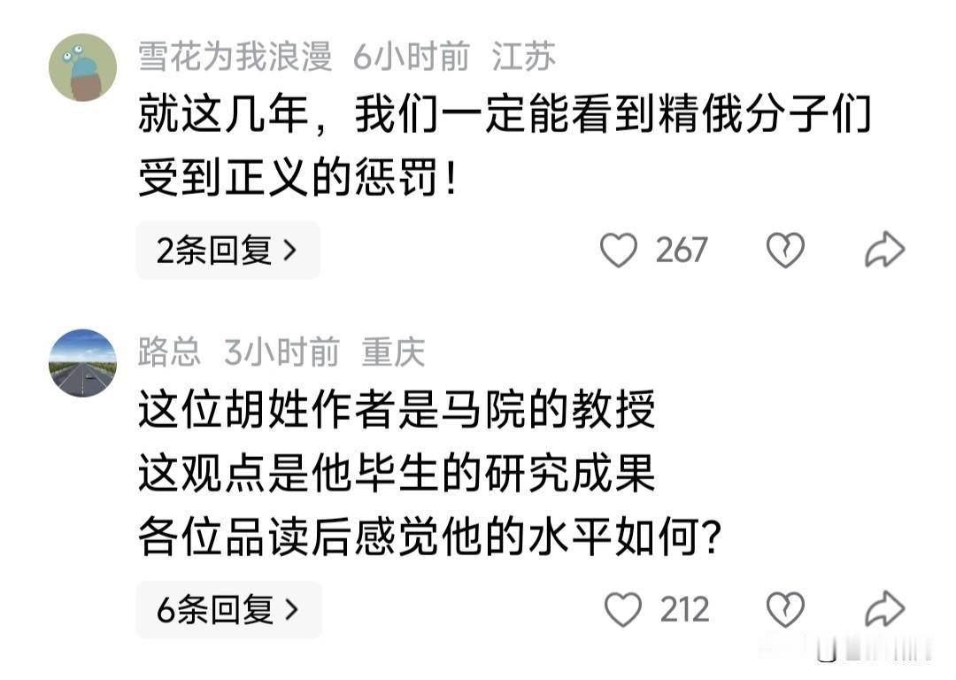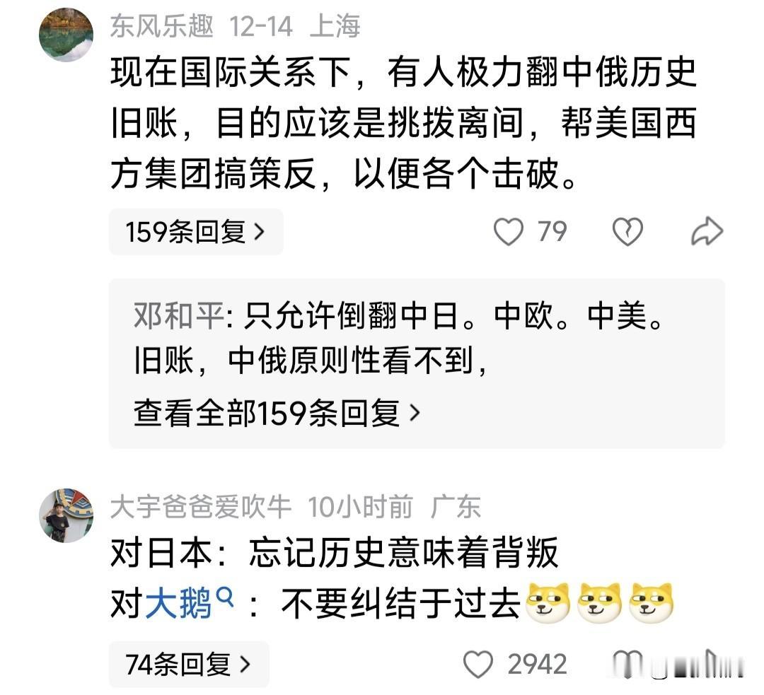 为什么总有人,喜欢翻中俄关系旧账?胡姓教授这篇文章,谁想遭到网友猛烈嘲讽!文章很长,大意是说:中俄有过不愉快历史,但现在是合作伙伴关系,我们不应过于纠结过去! 平心而论,本人觉得胡教授这篇文章,说得还算客观:历史已经过去,说多无用;要着眼当前世界局势,今后合作发展!但网友却不买账,纷纷在评论区留言批评!甚至冷讽热嘲。 网友批评什么?讽刺什么?苍狼不想复述,网友请看附录。主要说北方两个邻国,对我们伤害都很大。我们不能纠结一个,不纠结另一个。如果面向未来发展,另一个是否更重要? 苍狼觉得网友之言,说的也有道理!大家怎么看?欢迎参与讨论。 …………