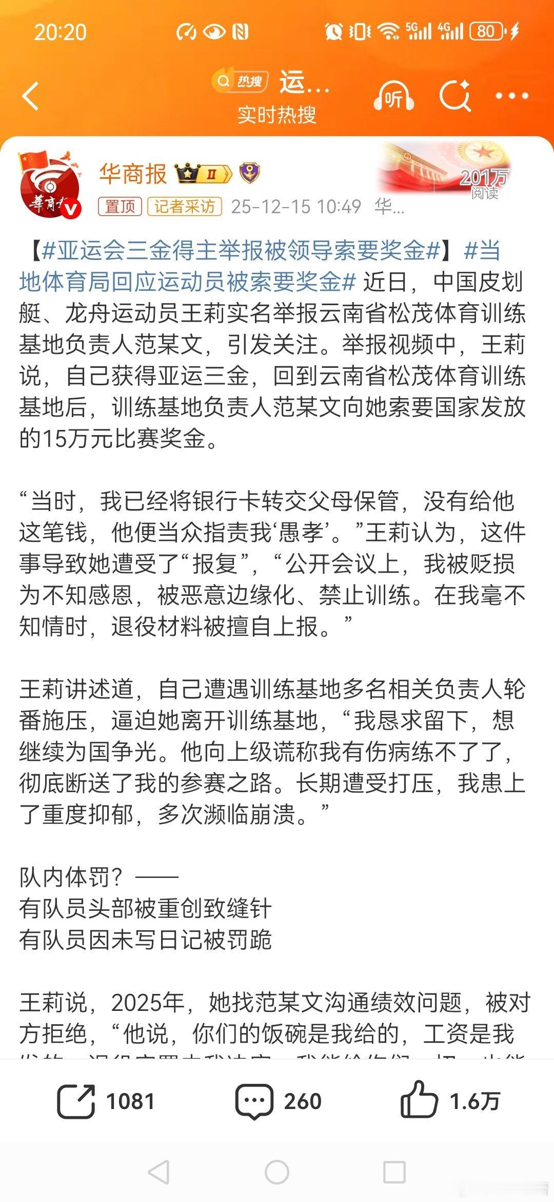 亚运会三金得主举报被领导索要奖金 :国家发给运动员的奖励领导凭什么伸手运动队内部家长式管理罚跪合理吗耐心等待官方通报,不听一方一面之词,一切以调查结论为准,相信调查结果。一切以证据为准,要用证据去支撑,持续关注后续,不偏听偏信,不要先入为主去定性。更不要带节奏,真的假不了,假的真不了,证据为王,以调查结论为准。