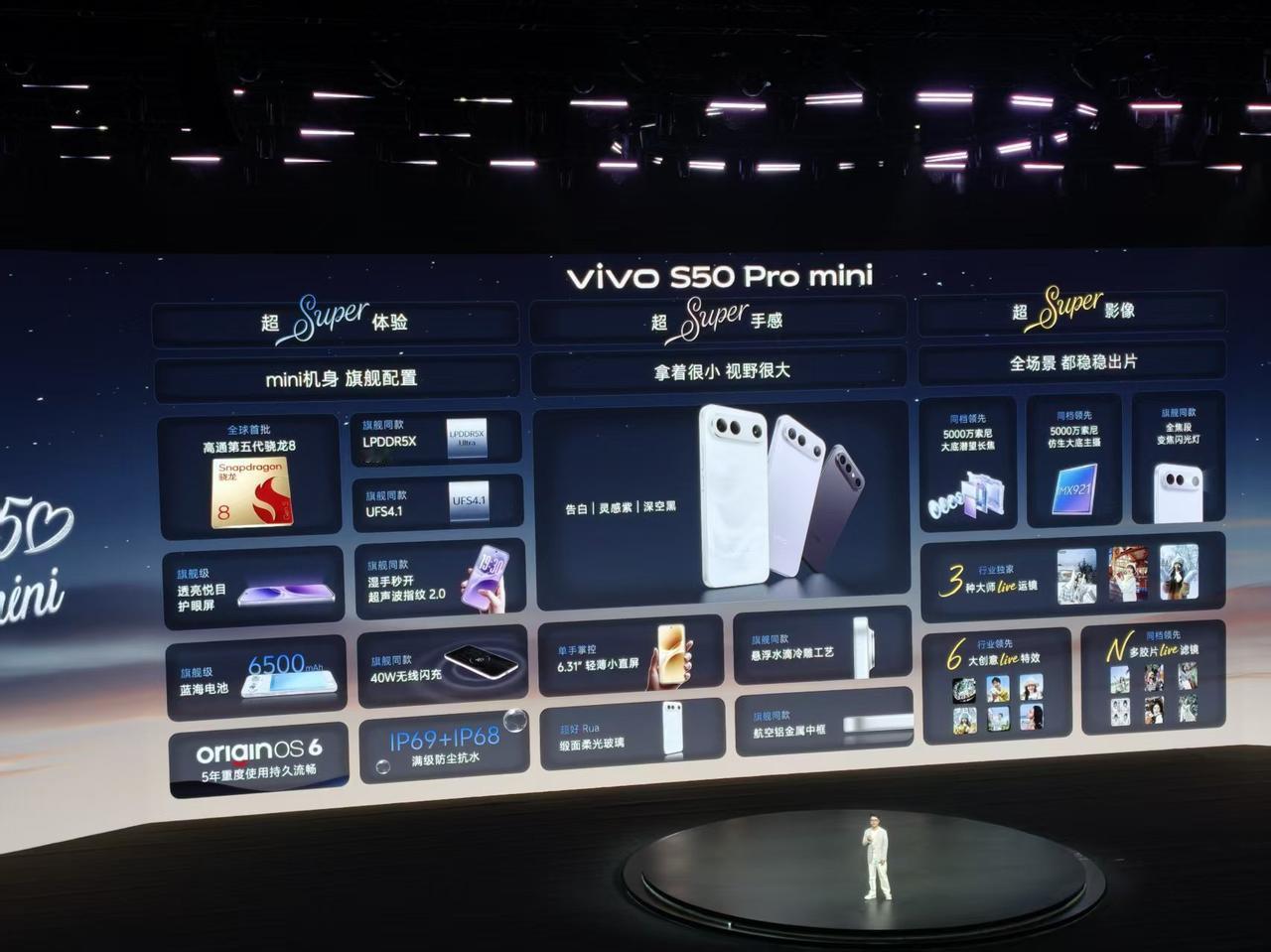 《一条带你看完田曦薇同款vivo S50系列》 全系潜望长焦 | 主打人像Live | 一键动态特效 | 自拍神器 vivoS50 【vivo S50 Pro mini:3699起,小屏版iPhone Air】 骁龙8 Gen5,LPDDR5X Ultra,40W无线充电;IMX921主摄、变焦闪光灯;6.31英寸1-120Hz自适应刷新率,全屏AOD,4320Hz 防频闪 PWM 调光 /2160Hz全亮度防频闪PWM调光,WiFi7。 【vivo S50:2999起,全能标准版】 3代骁龙8s,LPDDR5X;LYT700V主摄、柔光环;6.59英寸120Hz,4320Hz 防频闪 PWM 调光,WiFi6。 全系搭载:1.5K直屏,5000nits局部峰值亮度。前置5000万JN1+双柔光灯;5000万IMX882潜望长焦+800万超广角;6500毫安时电池+90W;二代3D超声波指纹、双扬声器、X轴马达、NFC、红外、IP68 IP69、寰宇智慧通信 2.0;金属中框,玻璃后盖;AI路人消除、AI定制美颜、撕拉片、涂鸦相纸。 Live玩出花:Super Live不只每一帧都清晰,玩法更丰富,新增高光慢动作(可以理解为一键格莱美运镜)、Live调音师、丰富Live滤镜。 vivo Pad5 Pro柔光版:3599起。