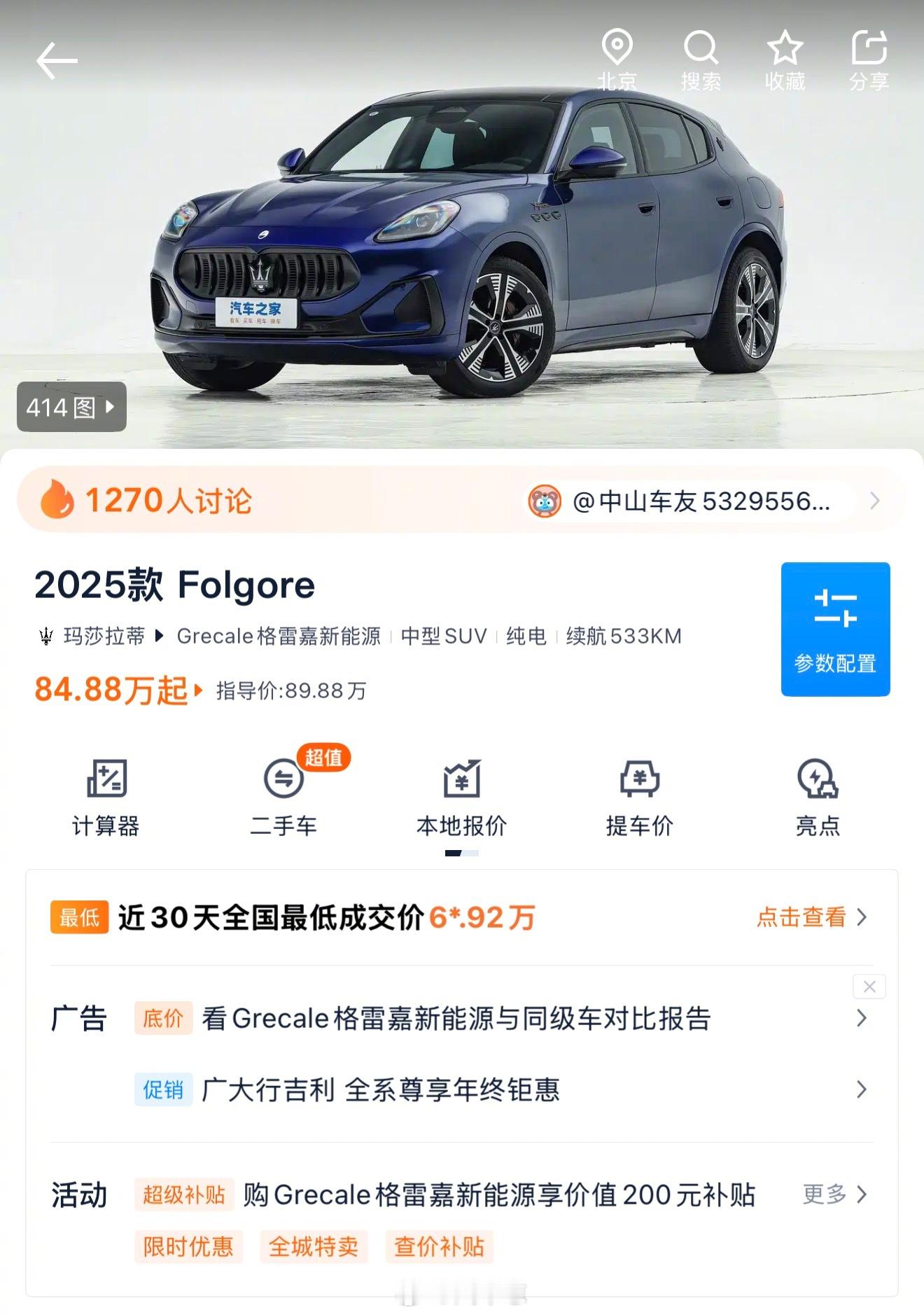曾经高攀不起的玛莎拉蒂只卖35万了格雷嘉纯电版,对标纯电Macan,指导价89.88万降到35.88万,直接打了四折,电车相对比油车省心,你们敢买吗? 35万纯电玛莎拉蒂被一抢而空