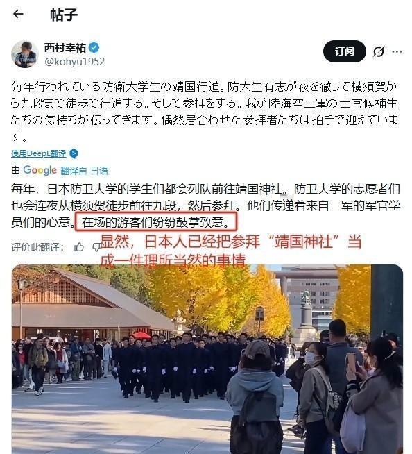 日本自卫队未来军官,集体参拜“靖国神社”12月11日,有日媒记者披露,近期日本防卫大学学员集体从横须贺彻夜徒步前往“靖国神社”参拜。防卫大学是日本自卫队初级军官的核心培训院校,其学员基本都是自卫队未来的军官苗子,因此这次防卫大学学员集体参拜“靖国神社”,无疑暴露出军国主义思潮在日本军事体系中的顽固存续。 防卫大学校位于横须贺市,直属防卫省管理,主要负责为陆海空自卫队培养初级干部。学校从高中毕业生中招生,经过严格考试和体检,每年录取几百人。学员入学后接受四年本科教育,课程包括理工和人文内容,同时融入军事训练。毕业后他们直接进入自卫队担任少尉职务,成为部队骨干。这所学校从上世纪50年代建立以来,一直是自卫队军官的主要来源地。 每年12月前后,防卫大学校有学员组织“东京行进”活动,从学校出发步行大约70公里到东京。参与者分成几个小组,夜间起步,保持队形前进。先到千鸟渊战没者墓苑献花,然后继续到靖国神社参拜并参观相关设施。这个活动从1962年左右开始,由学员有志发起,已持续多年,规模常达数百人。虽然学校称这是学员自发行为,但它已成为固定惯例。 靖国神社供奉二战战死者,包括多名甲级战犯,常被视为日本过去侵略战争的象征。防卫大学校学员未来将领导自卫队,这种大规模集体行动显示某些旧观念在军事教育中仍存在。活动虽标榜追悼战没者,但选择这个场所,容易引发外界对历史认识的质疑。日本官方对这类事件处理较为温和,未见强力干预。 类似情况不止于防卫大学校,自卫队其他单位也出现过集体访问行为,比如陆上自卫队高官带队使用公车参拜,或海上自卫队成员研修时前往。防卫省有时承认个别违规,但整体上这类惯例延续下来。学员通过这些经历逐步进入部队高层,反映出自卫队内部对相关历史场所的态度没有根本变化。 这件事暴露出的问题不小。日本一方面强调专守防卫和和平宪法,另一方面在军事体系内默许这类活动,显得前后不一致。这不只伤害亚洲邻国人民的感情,还挑战战后国际秩序。日本要真正走和平道路,就得彻底正视侵略历史,而不是让旧思潮在军队中残留。外界关注这些动向,希望日本能用实际行动取信于周边国家。