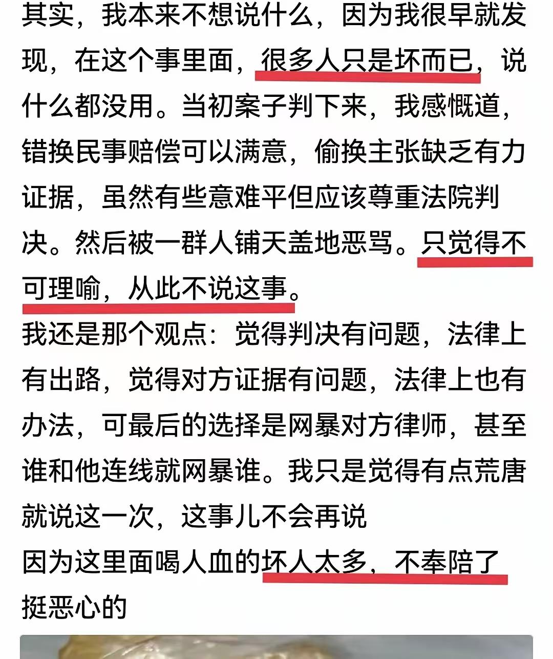 储殷回应被“网抱”,一句“坏人太多,不奉陪了”,储殷借“不奉陪”避重就轻,拉踩他人带节奏的操作难服众,公众人物更该谨言慎行。 他能网爆别人,别人不能说他。谁行谁不行,以什么为标准?这个准星是谁定的呢?储应记得有首歌词,老百姓才是那定盘的星,别把自己看的太高了,你那点小心思正常的网友是看的出来的。 今天下午我又看到一个视频,标榜北京大学的刘某斌,到北京找李律,要见一下李律,问李律28事件为什么吵成这样,杜某芝立马给刘某斌留言。 是谁先网爆了李律?自己心里没数吗?储是认不清自己,也看不清别人,谁是坏人还不一定,他要是认为杜是好人,那么…… 储说李是批评,为什么大众反驳储就是网暴?双标呀! 还是胖嬢嬢说的好,自己埋雷、自己点炮。你能说你自己是好人吗?看你的言论就知道你不是好人。 教授当着当着就成无业的了,靠蹭热点话题来找存在,斯文尽毁活成了大笑话。 谁让你出来的?谁让你赔了,你你不是早退了么又冒出来意欲何为。