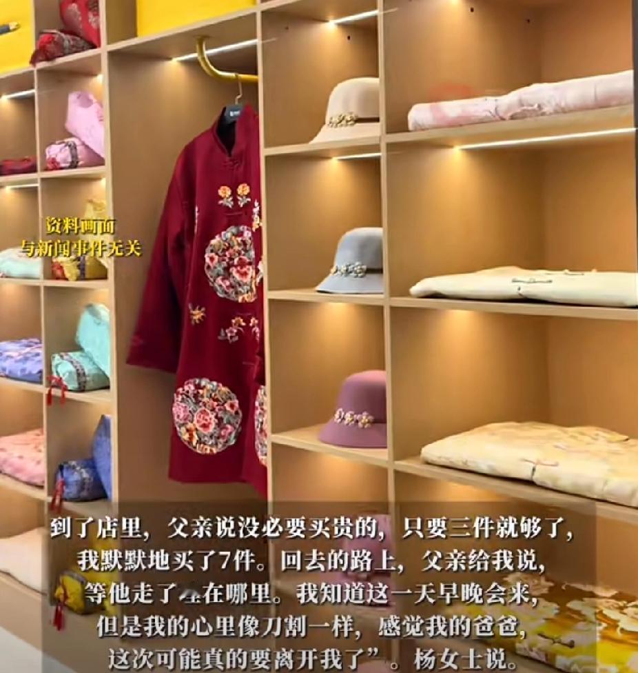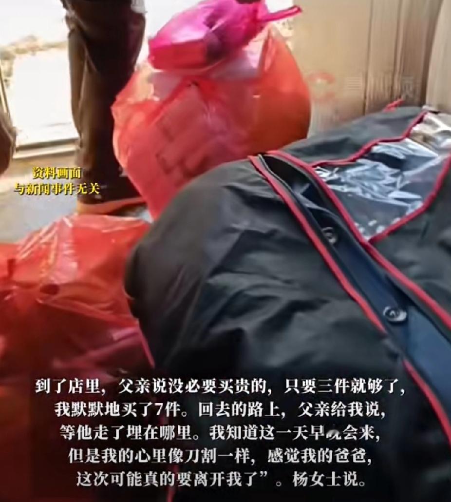 泪目!父亲肝癌晚期让女儿陪自己买寿衣,称买三件就够了!女儿心如刀割,默默买了七件!12月15日,是重庆的王女士心如刀割的一天。 杨女士的父亲于三个月前查出肝癌晚期,一直坚持治疗但情况不见好转,反而越来越糟糕,最近一直在住院。 可能意识到自己时日不多,12月15日,父亲突然提出让杨女士陪自己去选寿衣。杨女士一时间不知还如何回应父亲,默默地跟在父亲的身后。 到了店里,父亲说:“没必要买贵的,就买三件就行了。”杨女士心如刀割,默默地买了七件。 回去的路上,父亲说着自己走了要埋的地方,杨女士的心像被刀子剜了一样的疼。 杨女士说:“我知道这一天早晚会来,我还没有做好心理准备,听着父亲安排自己的后事,我突然意识到这次父亲可能真的要离开我了。” 曾经,父亲欢欢喜喜的迎接女儿的降生,几十年来如掌上明珠般扔在自己的手心。如今,女儿心如刀割听这父亲安排自己的后事,往后余生,再没有人能让自己喊一声爸爸。 别太难过,坚强起来,让父亲安安心心的离开,天堂的日子或许真的无忧无虑无病无灾呢!肝癌家属 重庆身边事