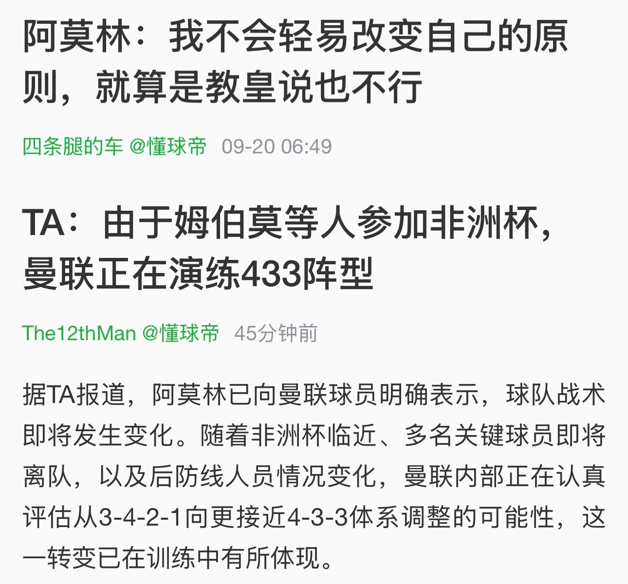 这是教皇托梦阿莫林了 TA.Whitwell(T2):曼联在训练中投入大量时间演练433阵型。阿莫林在对狼队赛前的队内会议中表示,球队即将进行变革。曼联 曼联vs伯恩茅斯