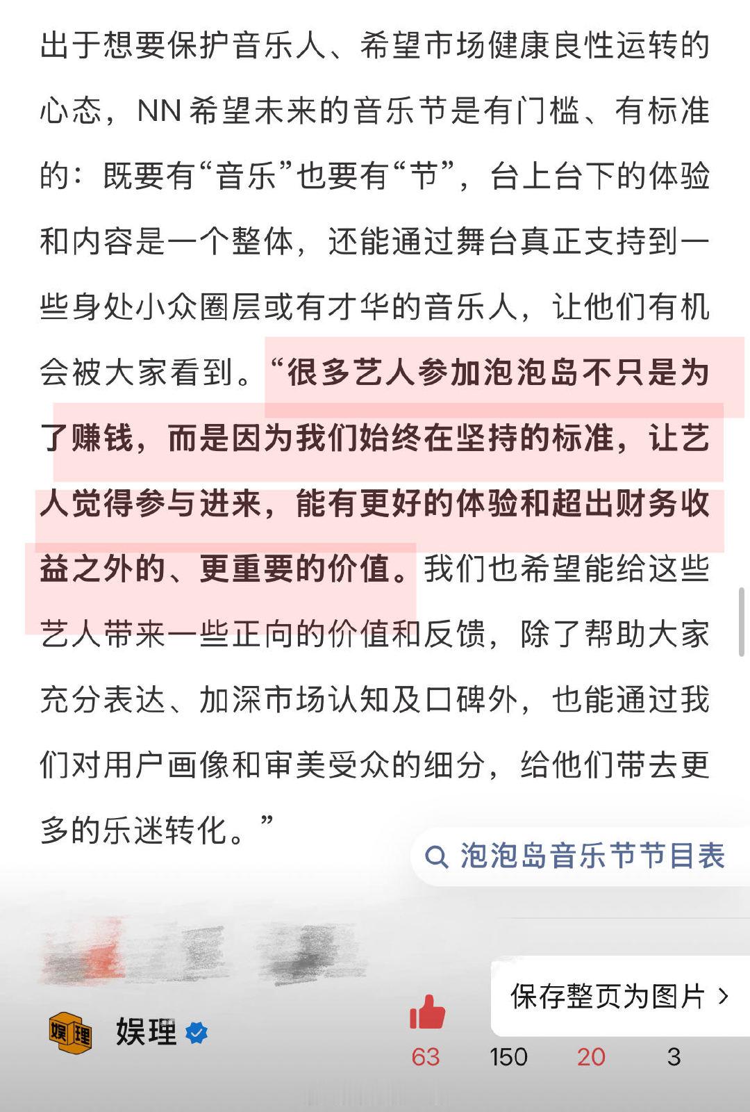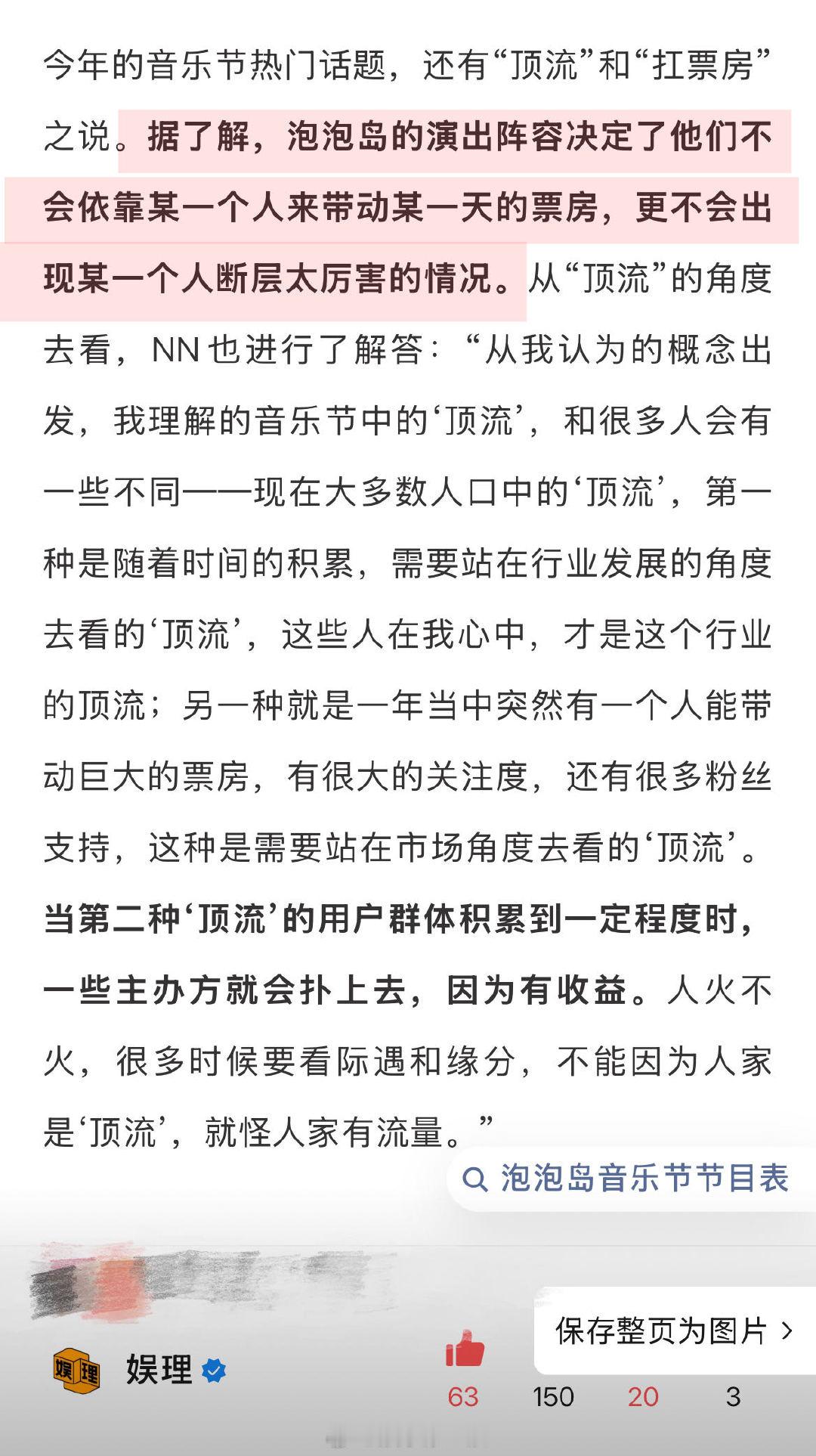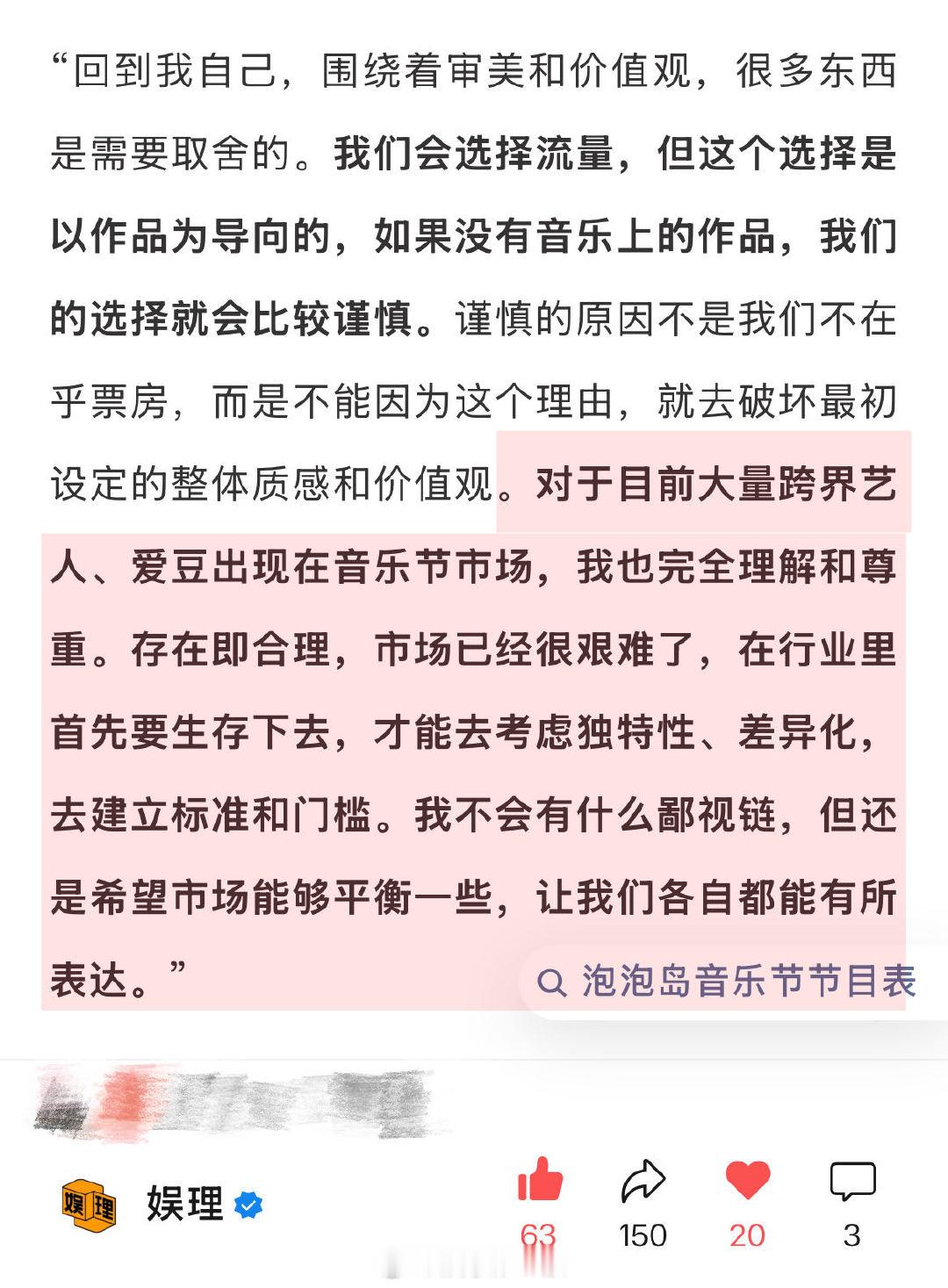 主办方谈音乐节顶流扛票房 泡泡岛音乐节阵容和艺人负责人NN:“我们会选择流量,但这个选择是以作品为导向的,如果没有音乐上的作品,我们的选择就会比较谨慎。对于目前大量跨界艺人、爱豆出现在音乐节市场,我也完全理解和尊重。存在即合理,市场已经很艰难了,在行业里首先要生存下去,才能去考虑独特性、差异化,去建立标准和门槛。我不会有什么鄙视链,但还是希望市场能够平衡一些,让我们各自都能有所表达。”主办方谈于适庄达菲上音乐节