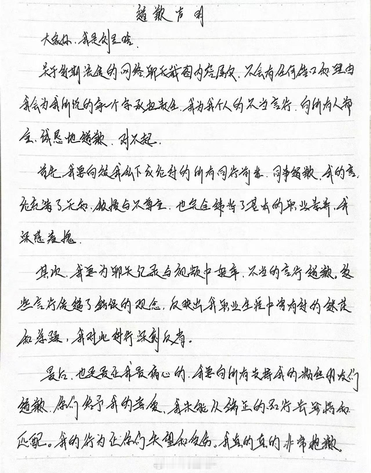 刘昱晗手写了道歉声明🙊“关于近期流传的网络聊天截图内容属实,不会有任何借口和理由,我会为我所说的每一个字承担责任”p4-p6是工作室曝光的刘昱晗嘴人的聊天截图内容刘昱晗道歉信刘昱晗聊天截图内容属实