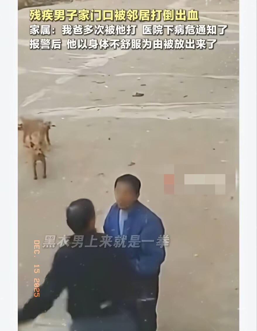 江西残疾父亲被打入ICU!黑衣男4次施暴细节触目惊心提前释放引众怒! 江西一位残疾父亲被邻居黑衣男多次殴打,最终住进ICU的消息看完让人怒不可遏!随着更多细节被扒出,网友直呼“这哪里是邻里口角分明是恶意报复!” 最让人脊背发凉的是黑衣男的嚣张与算计:专挑工作日上午10点动手算准受害者子女上班邻居外出买菜,没人能及时阻拦;之前4次殴打后都以“邻里矛盾”轻描淡写掩盖,还威胁受害者“敢说出去就再打”。 更过分的是过往的施暴记录:去年3月残疾父亲左臂被打骨折,黑衣男找了“劝架失手”的借口,还托人给派出所送了箱水果,最后只赔500元就了事;今年7月父亲额头被打肿,因没监控对方不认账,又一次不了了之。一次次的纵容让黑衣男越来越大胆,最终酿成ICU的悲剧! 而黑衣男被抓后的操作更离谱:声称自己有心脏病不到24小时就被释放,可去医院检查时,血压心电图全正常,连慢性病都没有!这个释放流程比常规案件快了近3倍,完全不合常理,难怪受害者女儿坚决表示“不会和解一定要讨公道”。 残疾父亲本就弱势却遭遇如此多次恶意殴打,黑衣男的嚣张气焰、疑似“走后门”的释放流程,都让网友愤怒不已:“不能让老实人受欺负!”“必须严查释放原因,给受害者一个交代!” 目前当地已表态会跟进处理,受害者也提交了伤残鉴定。希望能有更多邻居站出来作证,让施暴者得到应有的惩罚也希望相关部门能彻查背后是否有违规操作,还受害者一个公道! 你怎么看待这起恶意殴打事件?