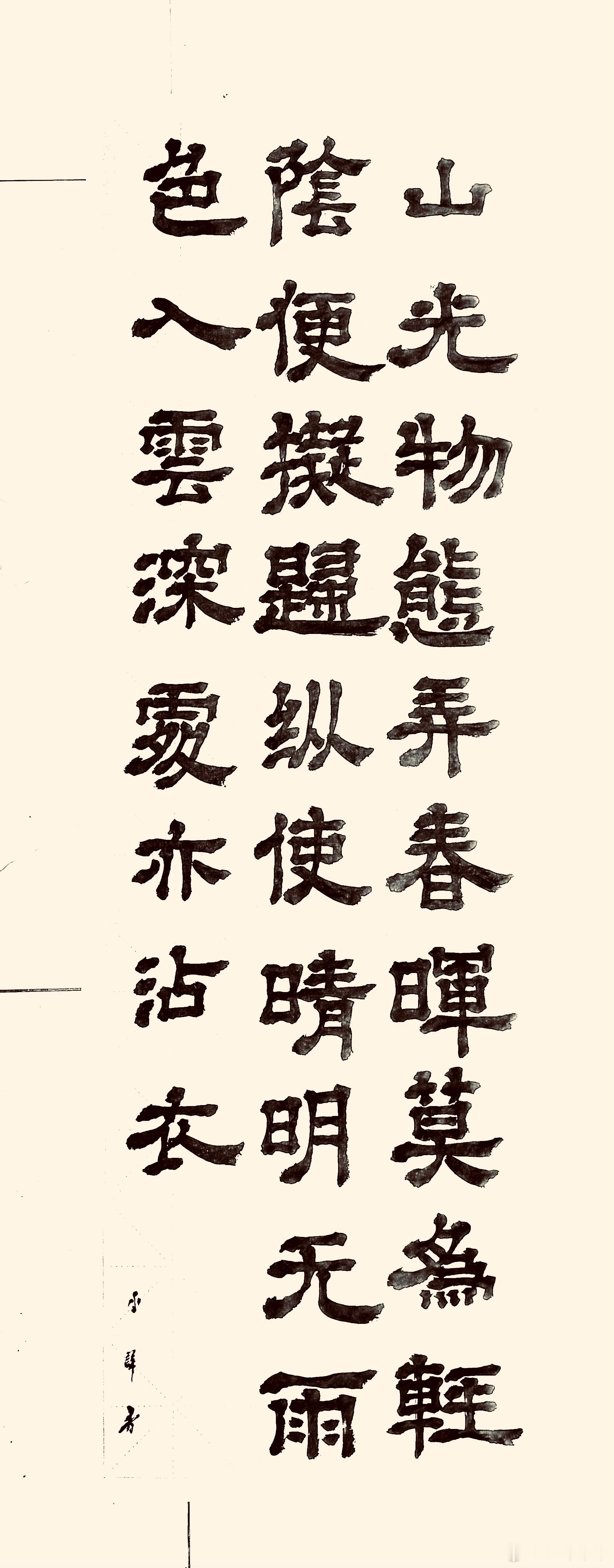 书法 山行留客(唐.张旭)山光物态弄春晖,莫为轻阴便拟归。纵使晴明无雨色,入云深处亦沾衣。 《山行留客》是一首七言绝句。此诗通过对春山美景的整体描绘和对客人欲离去想法的否定及劝说,表达了诗人对自然美好景色的喜爱之情与希望和友人共赏美景的愿望,并蕴含着要欣赏最美景致就不能浅尝辄止的哲理。篇幅虽短,却景、情、理水乳交融,浑然一体。全诗语言质朴,虚实相间,跌宕自如,词浅意深,耐人寻味。