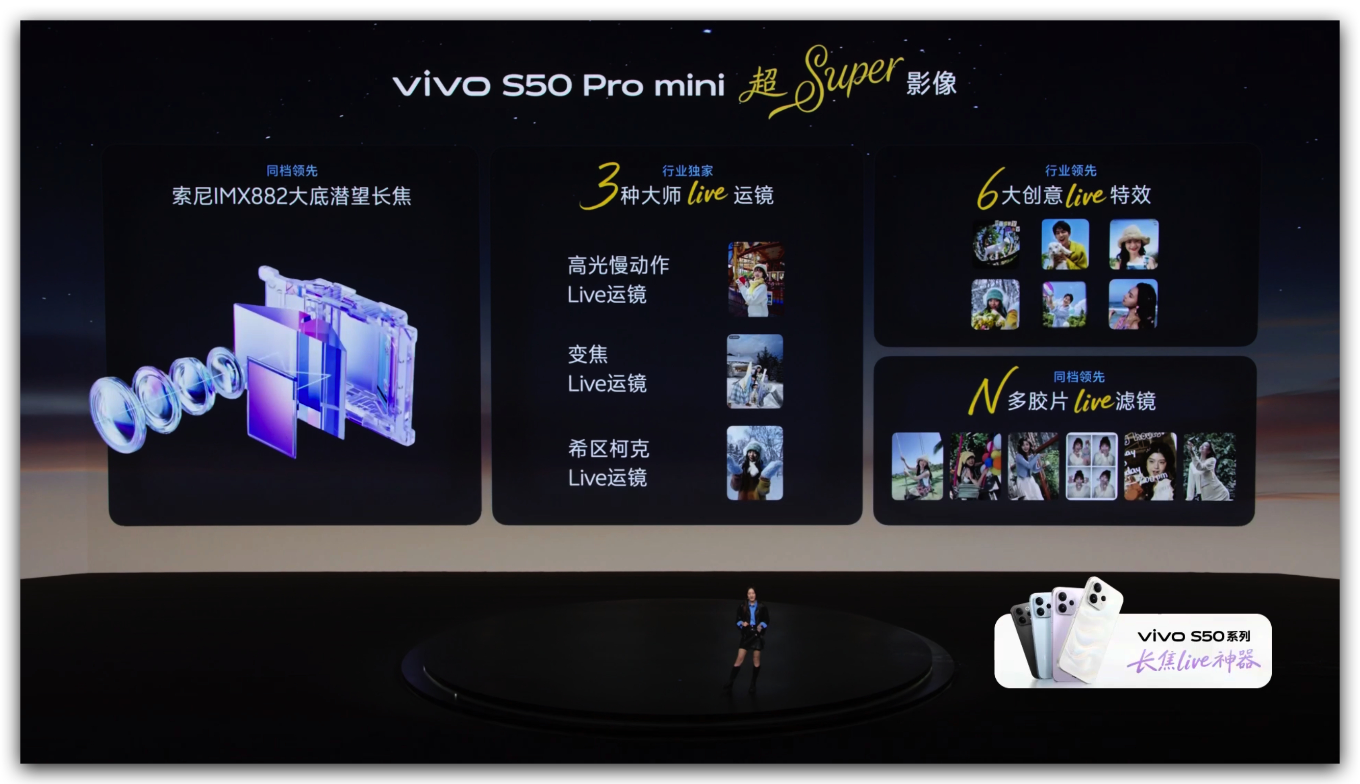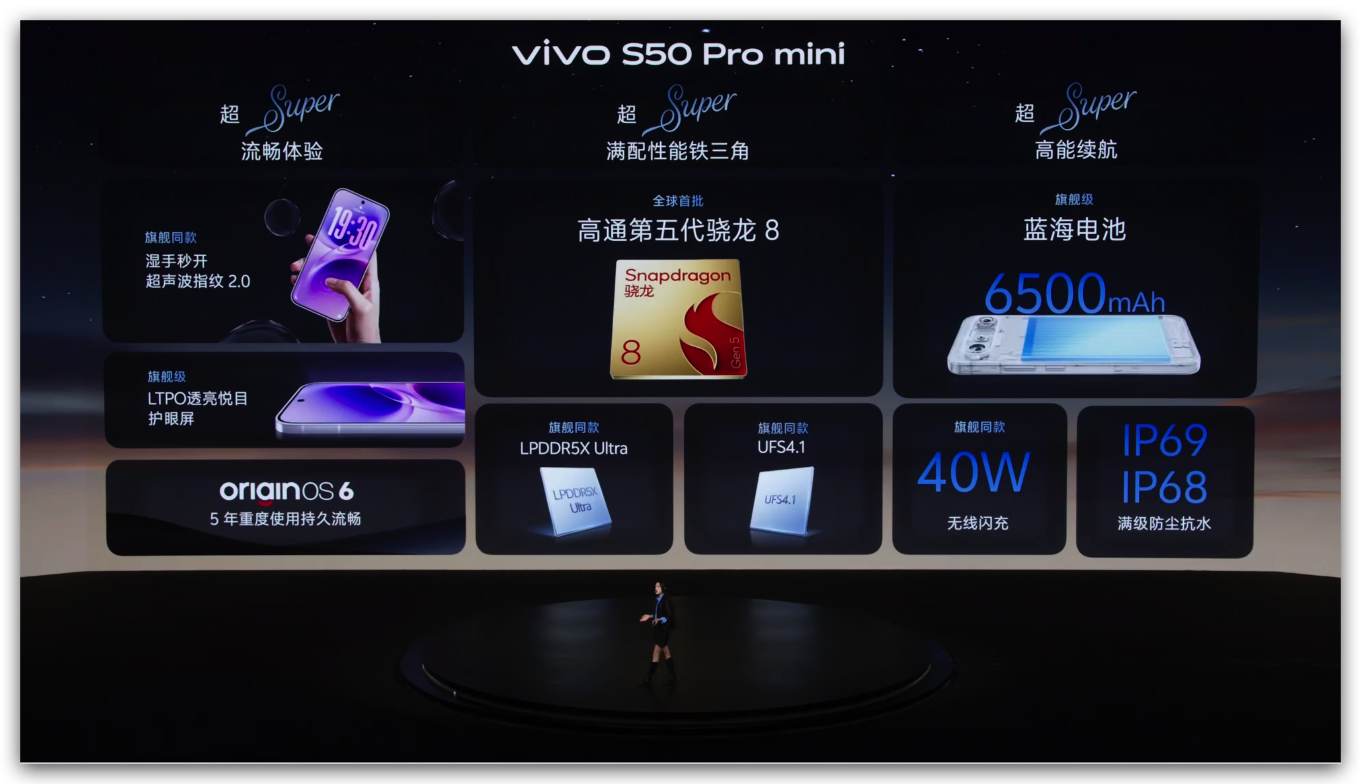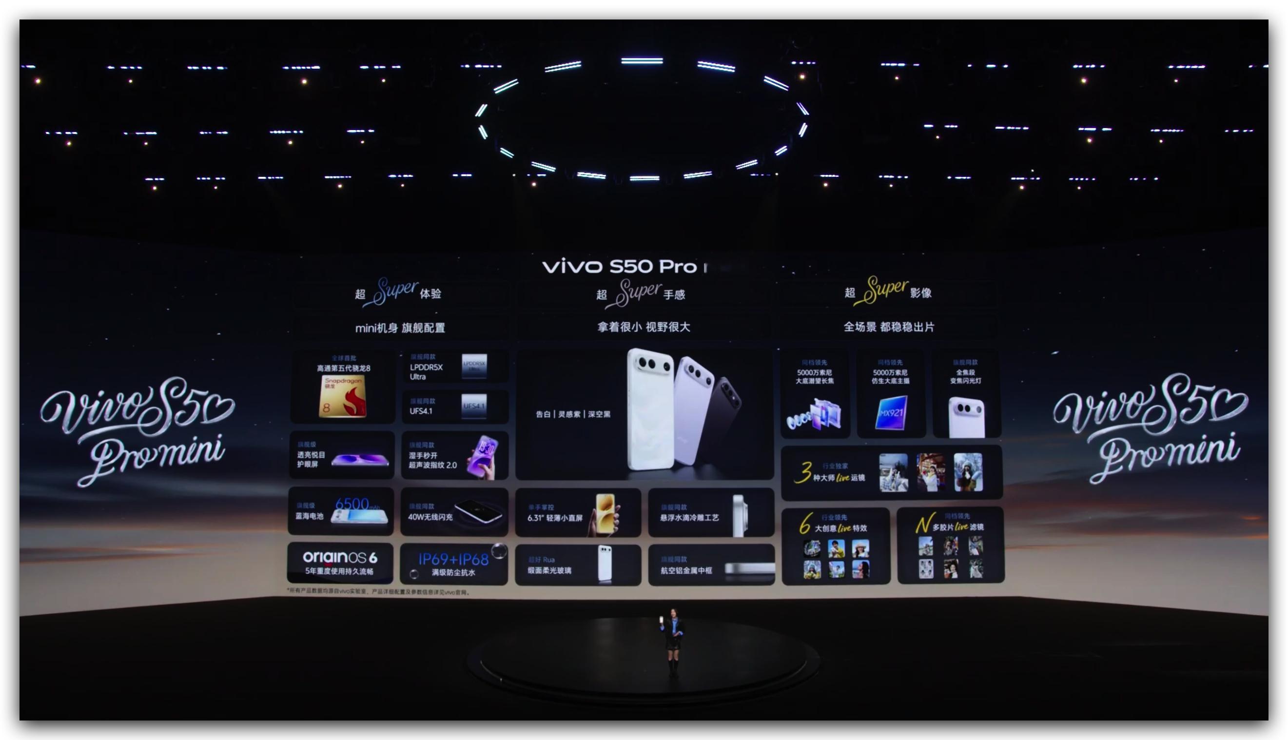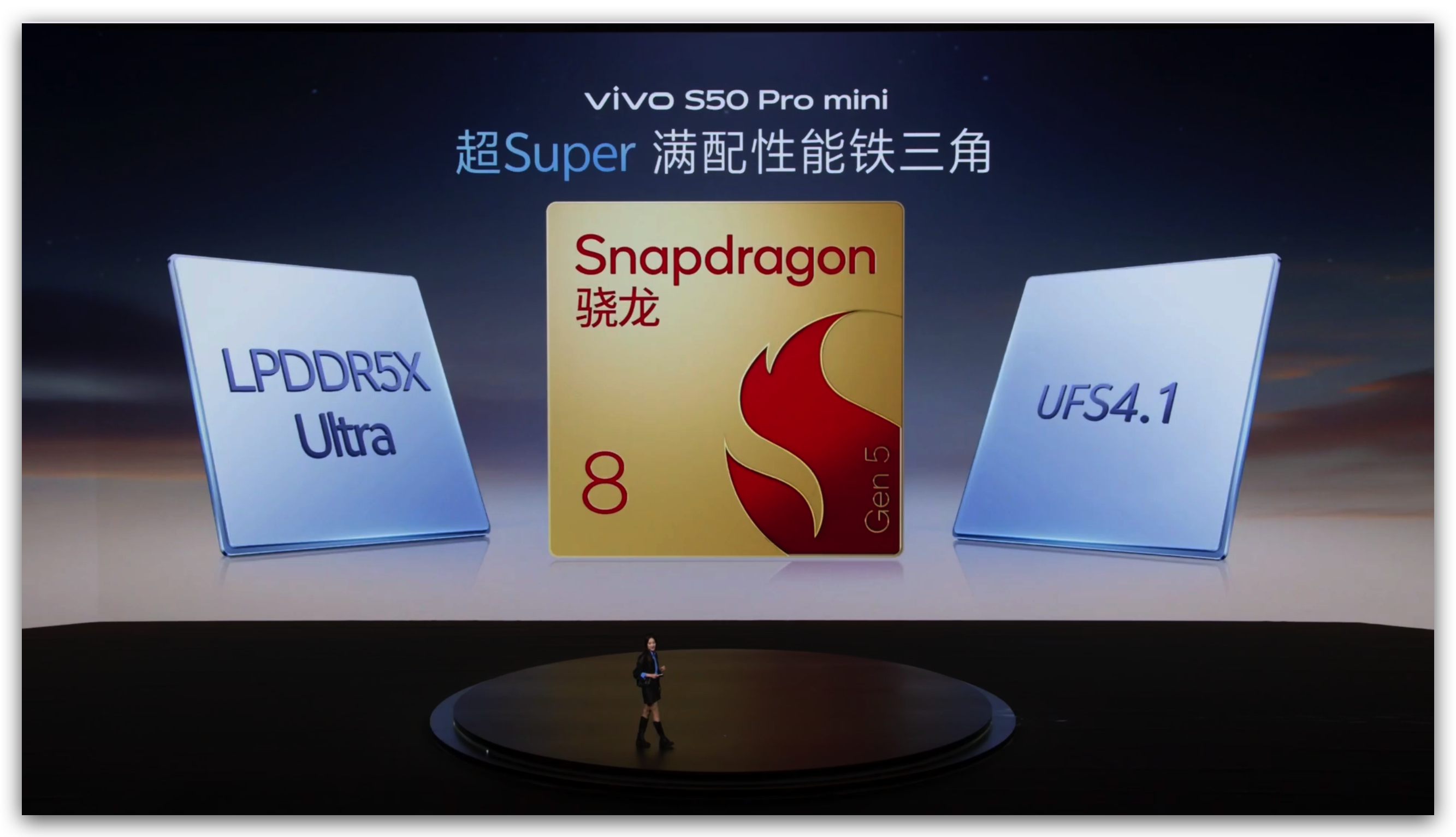 vivo S50 Pro mini 来啦!小“Air”,拥有白色、紫色、黑色三款配色,采用6.31英小屏,搭载第五代骁龙8处理器+LPDDR5X UItra+ UFS4.1,安兔兔跑分331W+,6500mAh大电池,支持40W无线闪充,支持IP68+IP69满级防水,影像方面采用了50MP 索尼IMX921主摄,50MP 索尼IMX882 大底潜望长焦 组合,并且还支持全焦段变焦闪光灯。