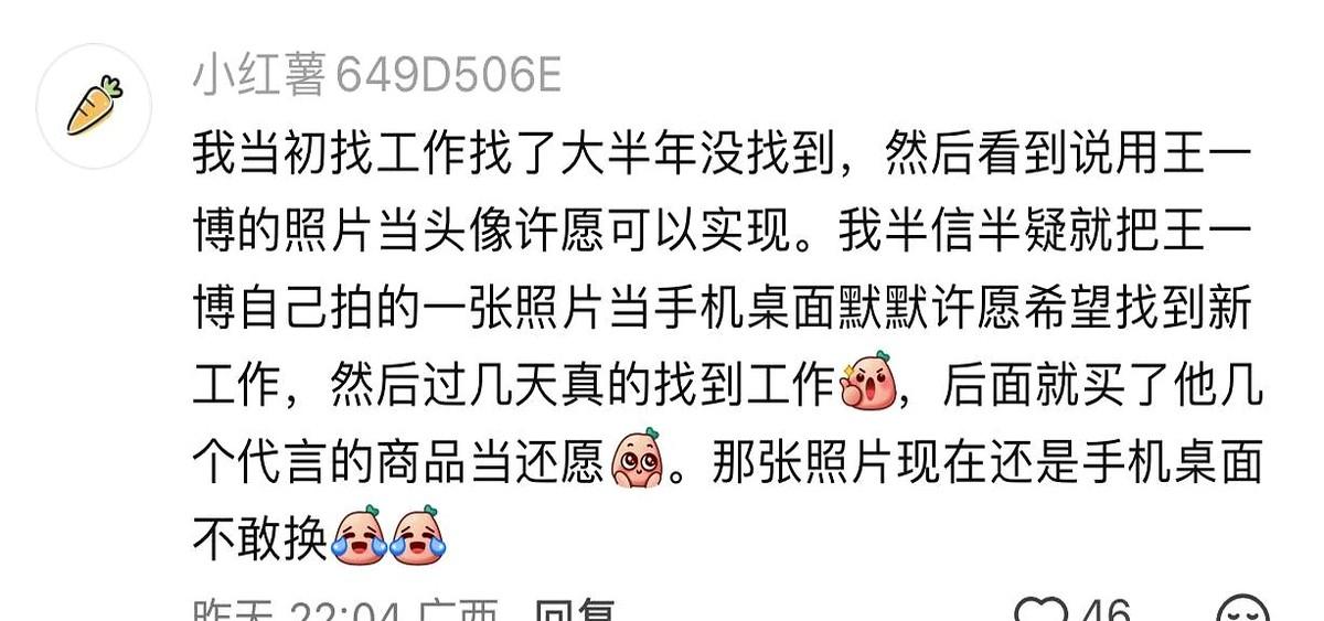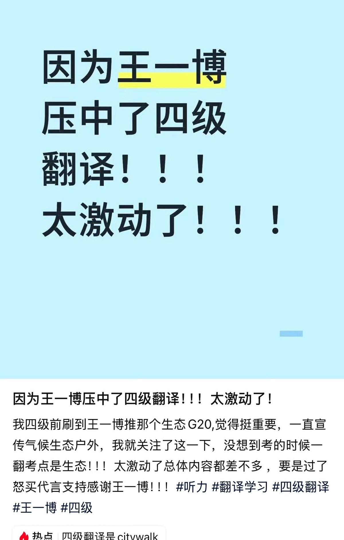 拜王一博还能押中四级考题?! 简直了! 今年英语四级考试,一个博主就因为他,直接押中了题目,整个人都感觉被幸运砸中了。 评论区一看,好家伙,原来不止一回了! 还有人找工作,把王一博照片设成屏保许愿,没几天就收到心仪的offer…… 粉丝还整理了不少他的“气运之子”冷知识,说他就是有这种“小福星体质”,妥妥的“小福娃”一个。 😂 这事儿一出来,说法还挺多。 有人觉得这就是玄学,信了准没错! 也有人说,这都是巧合,努力加心理安慰罢了。 我倒觉得,这更像是一种积极的心理暗示。 心里有个念想,相信自己能行,干啥事儿都更有劲头了,结果自然不会差。 反正现在,他这个“锦鲤”的属性是传开了。